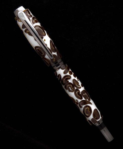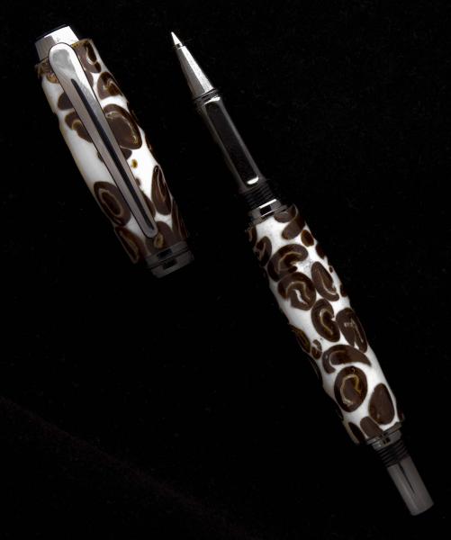 Black Titanium Navigator in Coffee. Smells great while drilling and turning. Kept using thin CA to soak the blank to prevent breakout. CA finish X 6 coats, MM to 12000, and HUT plastic polish.