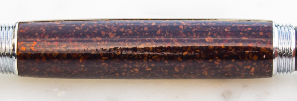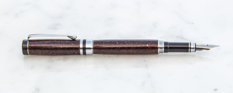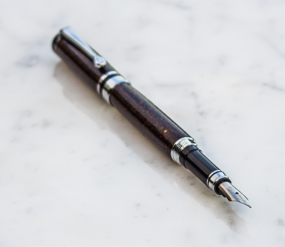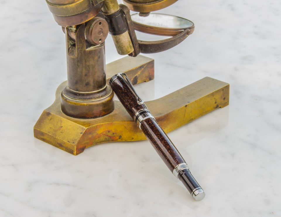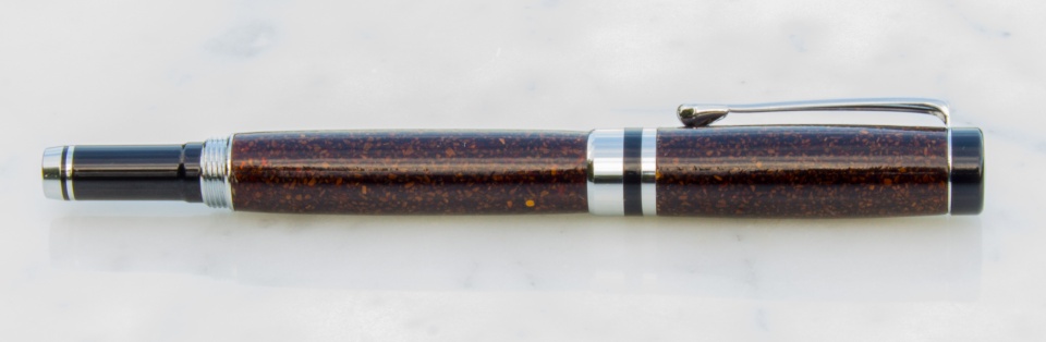 This is nothing compared to what a lot of y'all are making, but I'm pretty happy with my newbie results. :biggrin: Coffee grounds, dried and cast in Alumilite, and a PSI fountain pen kit in chrome.
