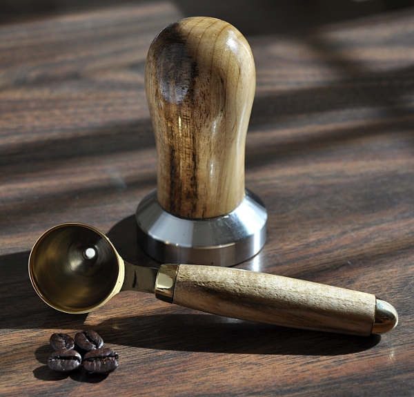 Expresso tamper and coffee scoop. Both of Oregon myrtlewood, finished in many coats of WOP.
