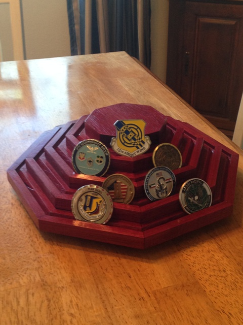 Finally finished this project. Cut all of the pieces then when putting them together, I discovered that my angles were 1/2 degree off. Not a big deal but it did leave gaps on every piece. So I recut every piece. Made a base to allow it to rotate. Base consisted of a piece of purpleheart wood and a piece of plumbing PVC. Inside the holder itself, I mounted another piece of plumbing PVC that fit perfectly inside the base. No noisy ball bearings from the lazy susans that I have found. Going to be making another one but it will be a square, not an octagon. Less angles to worry about. Now that I have a laser engraver, the next one will have the top piece engraved to make it a little more personalized for the customer.