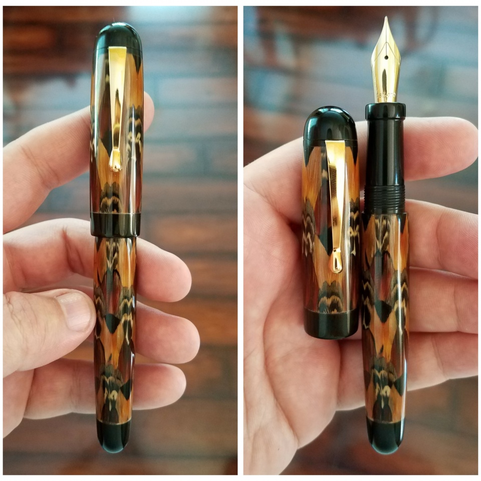 One of my good customers came to me with a request for a custom pen with some sort of pheasant theme. Something in memory of his father. I immediately thought of JohnU. So a while back I got in touch with John about doing a custom pen with pheasant feathers. It took some work on both our parts, but we made it happen! The accents are black ebonite and has a 18k nib.