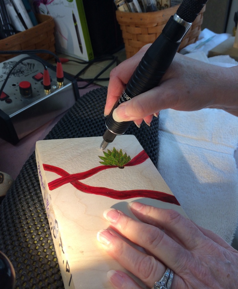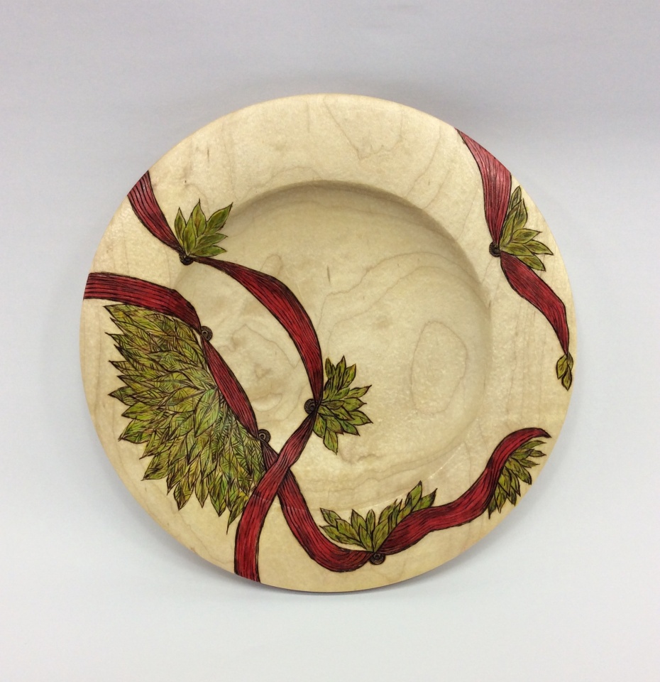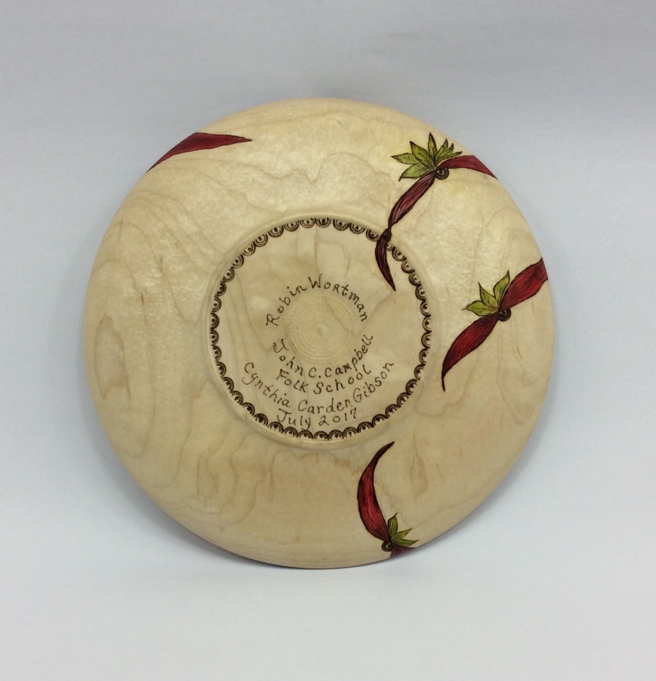 This is an 8" soft maple platter turned by my hubby (Charlie Wortman) and embellished by me. Embellishments include pyrography, acrylic paint, and India ink. I created a "hammered" texture on all non burned or painted surfaces with a reciprocating tool and finished with 1 coat wipe on poly, buffed, and then finished out with a little Ren wax and final buffing. This would not be possible without the fabulous tutelage from Cynthia C. Gibson at John C. Campbell Folk School this summer.