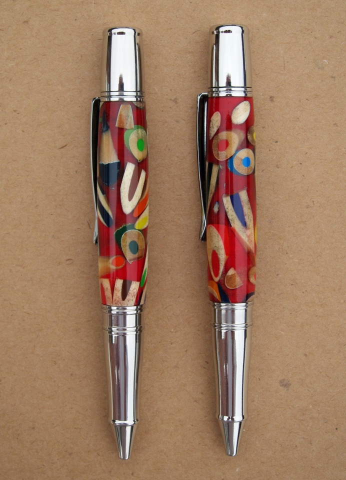 These two pens are my first time placing some object in a blank and casting it. These are the sharpened ends of colored pencils cast in resin.