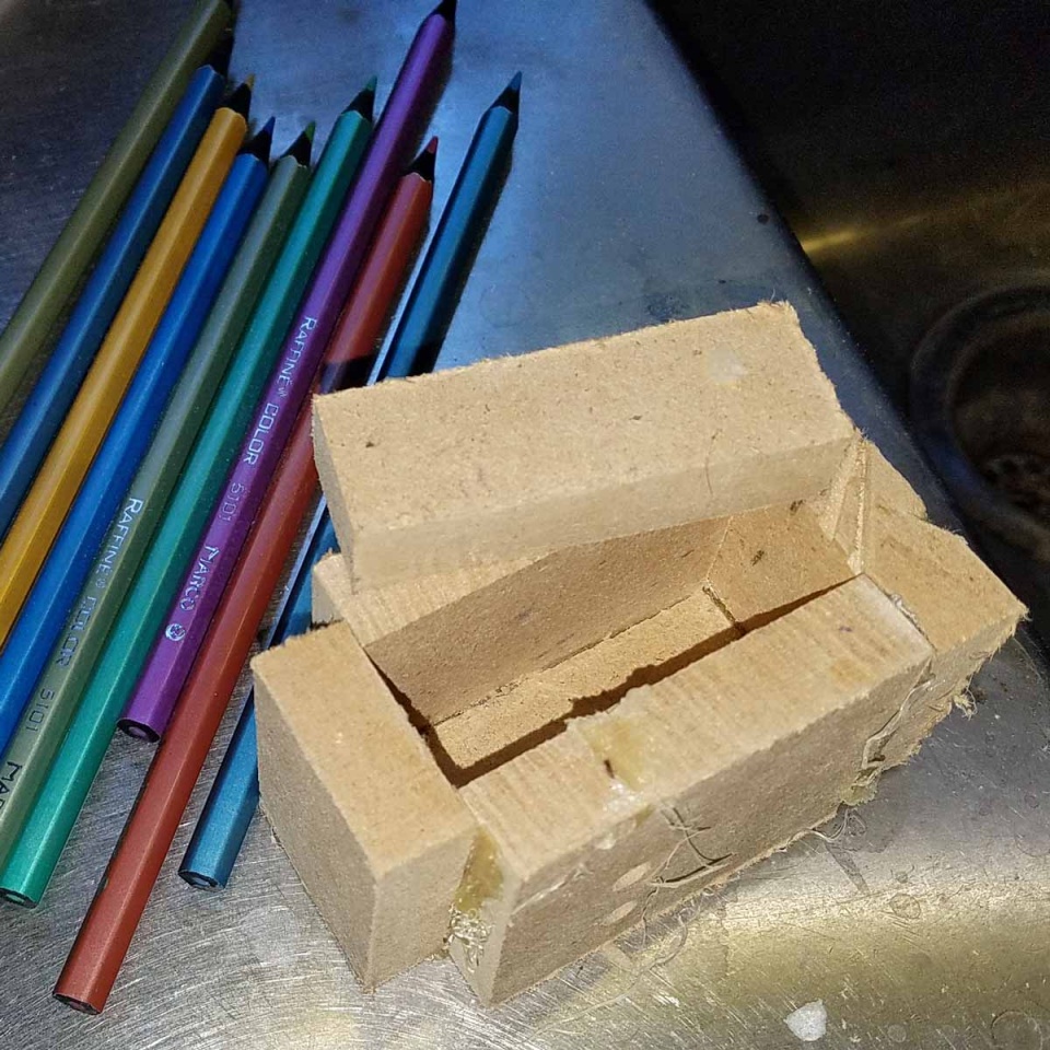 I acquired some black filled pencils at amazon and cut them up into little 3/4" lengths. Figuring that getting them cast together nice and tight was going to be important, I built a little sarcophagus to hold them and give me something to clamp while the epoxy set. I used Liquid Diamonds Epoxy, and would have used black alumilite dye, except I discovered at the last minute I didn't have any. So to make the epoxy black I mixed in a liberal amount of Harbor Freight Black Powder coat. It took three vertical rows of pencil nubs to get to 3/4" tall. After layering in the epoxy and nubs, I put the lid on the sarcophagus and affixed a couple of clamps to it, then put it in the pressure pot overnight at 35psi or so.