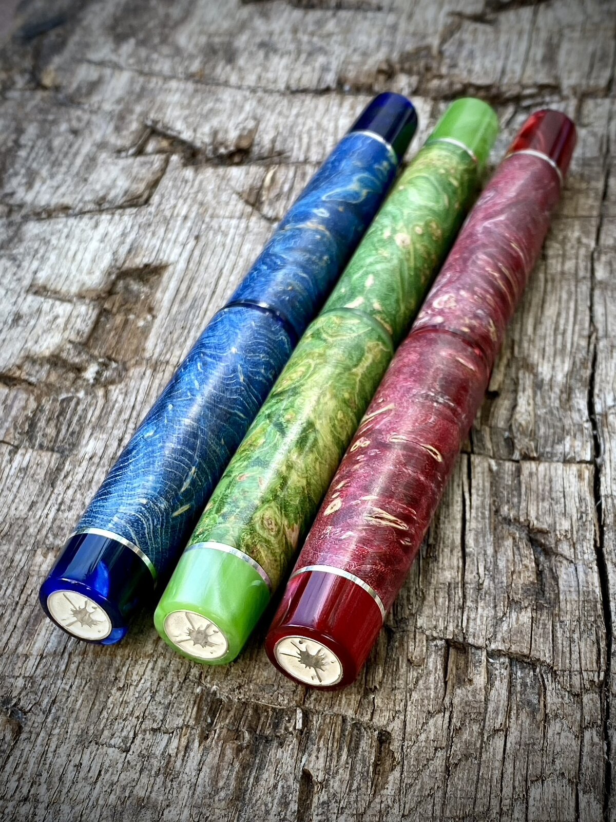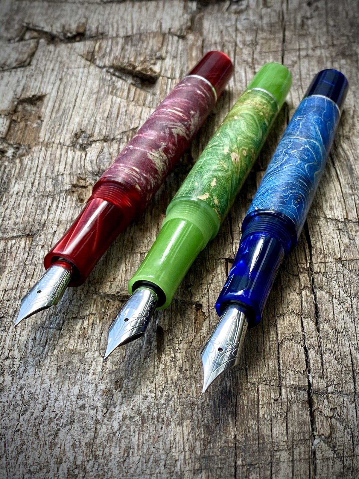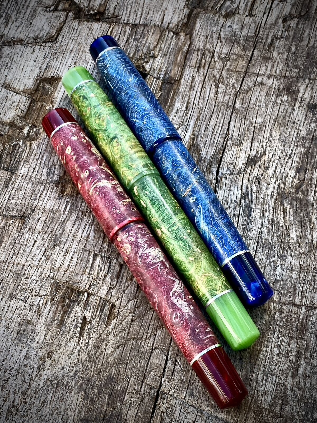 I've paired them with matching acrylics (and cellulose acetate for the blue one), which is also used to fully line the caps and barrels. Sterling silver finishes the pens which are fitted with both Bock (red) and Jowo no6 nibs.