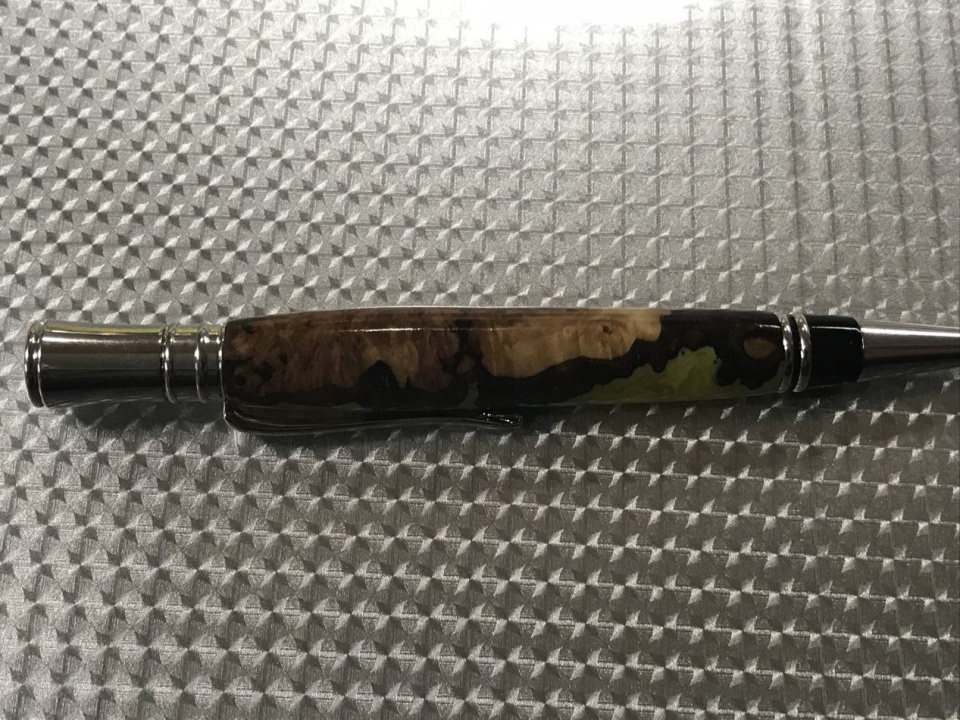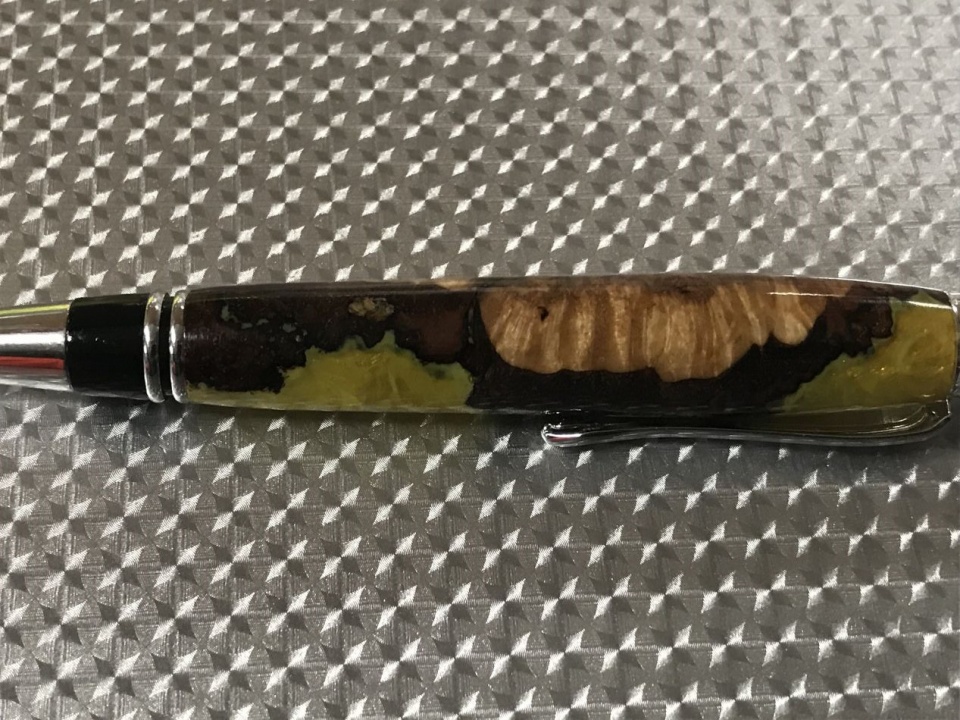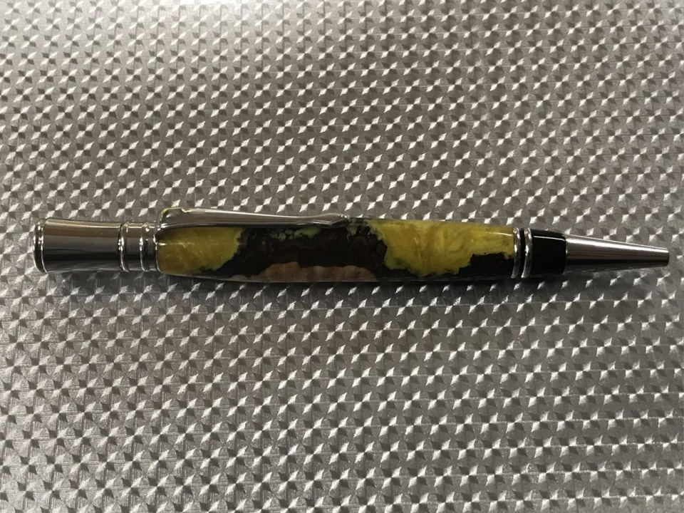 This was a small piece of locally harvested white birch burl, stabilized with the bark left on, then cast with yellow alumilite with yellow mica powder. I did not paint the tube but the little bit that shows is only there if you look really hard.