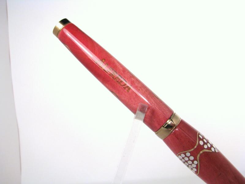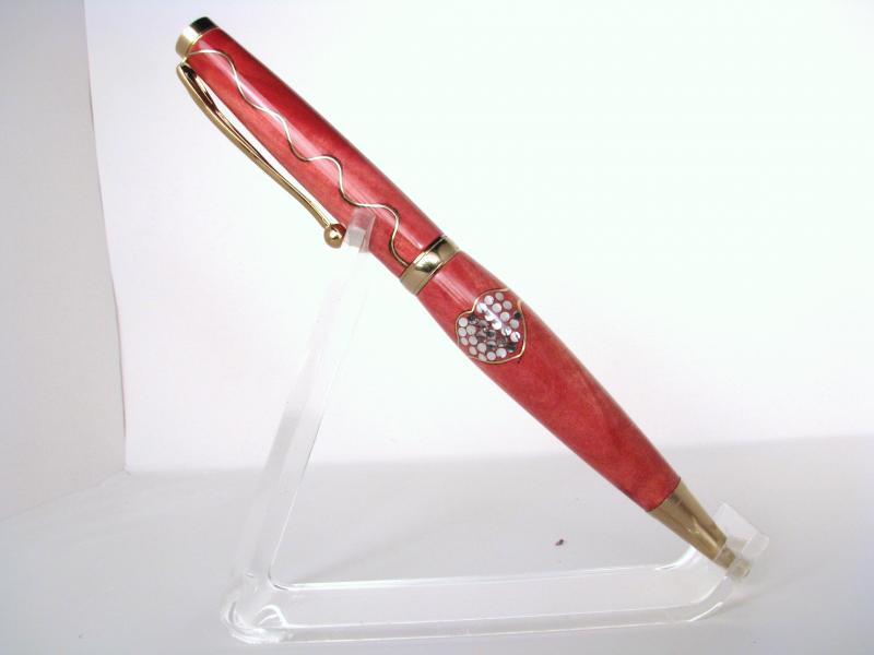 This pen was a major learning experience! The girl that wanted this asked for everything I could do to a pen. (just about anyway) And, she asked about the crystal fill for the heart on both sides of the pen. This was my first pen using crystals. There were 57 crystals total! I learned that pink ivory does not like to be cut with a scroll saw or segmented lengthwise. All in all I had 7-8 attempts on the top section, but I only had to have it engraved once! (which I was very thankful for!) The bottom part I had 1 failed attempt, and the one you see was attempt number 2. I am still working on getting the engraving fill right. I think epoxy with mica powder will work best, and I plan on doing that with my next engraving. This pen took a lot of time! Thanks for looking, and all C&C are welcome.