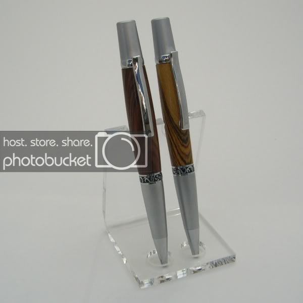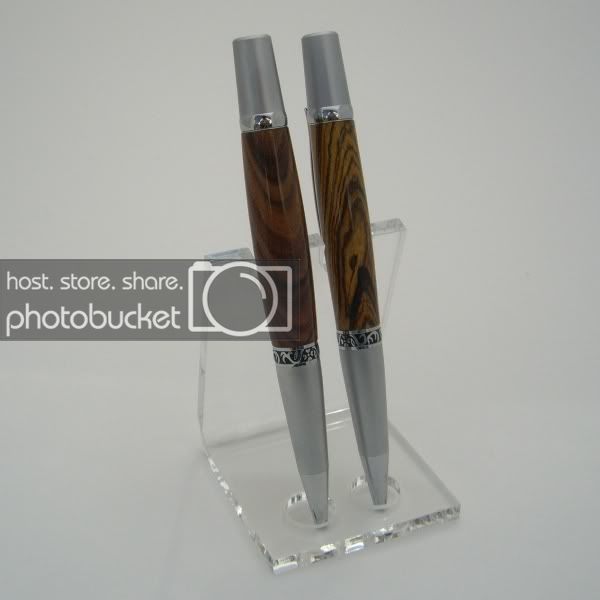 Sorry about that and thanks for the replies. The wood on the left I beleive is diagonal cut Bolivian Rosewood and the pen on the right is diagonal cut Bocote with some sapwood. Both have 10 coats of thin CA for a finish. The gloss on the Bocote is kind of lost in the light box for some reason. I kind of feel the same way about the pen kit. I like the wood, but it just doesn't look right to me paired with that kit. Several people at work like it and several more don't. I know different people like different things and I'm trying to add a little variety to the pens that I have been turning.