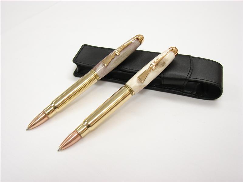 Rifle Cartridge Bullet Pens with Shed Deer Antler and Gold 7mm Euro Rifle Clips.