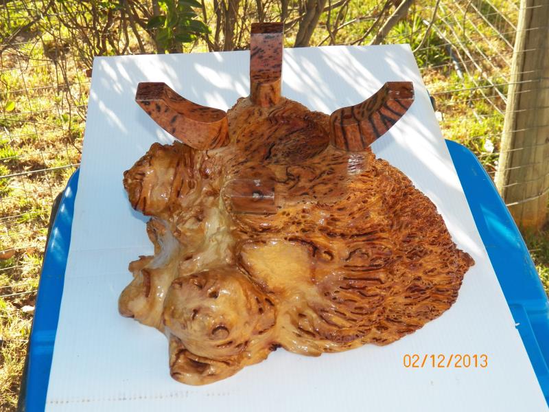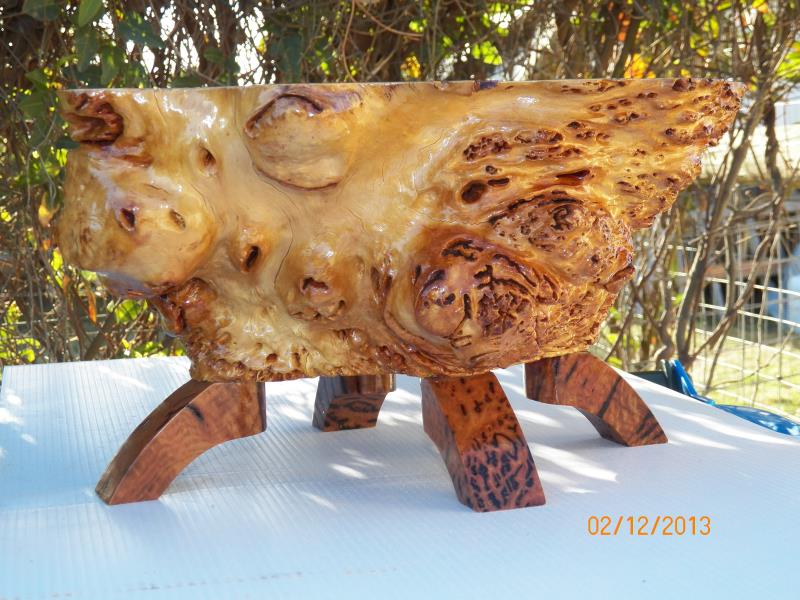 One of the problems was that, the piece is heavy and the wood of these burls is full of crystal veins that can make the wood very weak and fragile, so, after shaping the legs, they had to be fully soaked with thin and medium CA's to make the whole thing as a solid piece of wood.