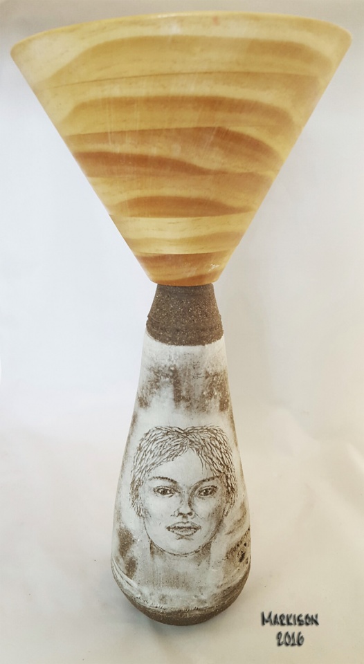 She wanted a life drawing for "freshness", no photos allowed - so she posed for one hour as I scratched carefully through the thin layer of porcelain back to the dark clay on the leather-hard vase that I had thrown 2 days earlier (sgraffito technique using tooth picks, dental tools, fiberglass brush, and steel wool). Reminds me of wood turning - no erasures - no going back. I made the conical pine wood speaker as explained in the earlier post.