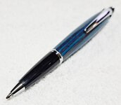 This is a PSI Compson click pen in chrome. The blank is a SpectraPly called Dark Aqua from Woodcraft. The finish is Mylands and carnuba wax.
