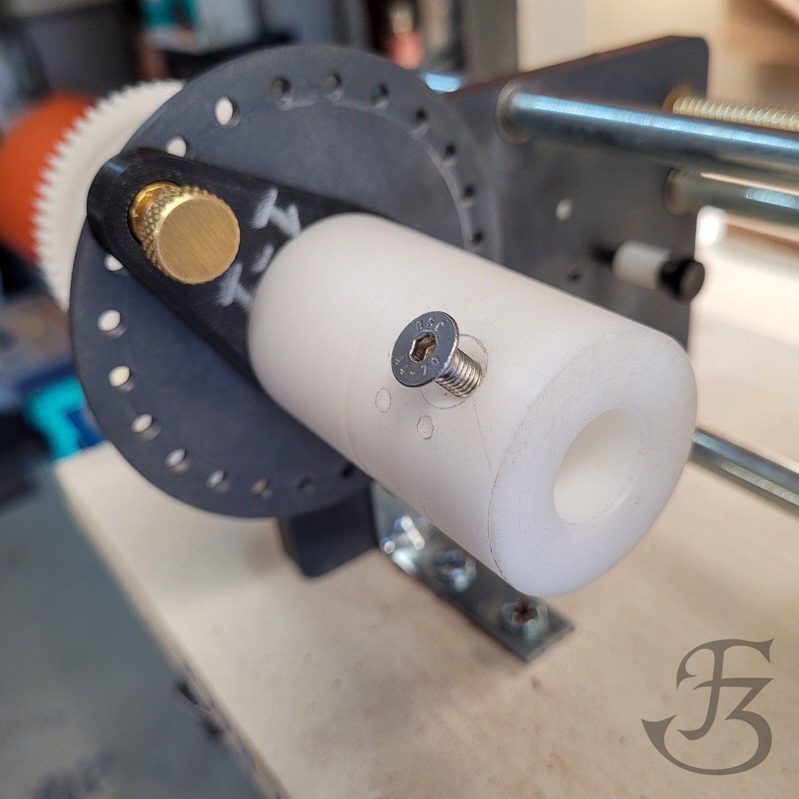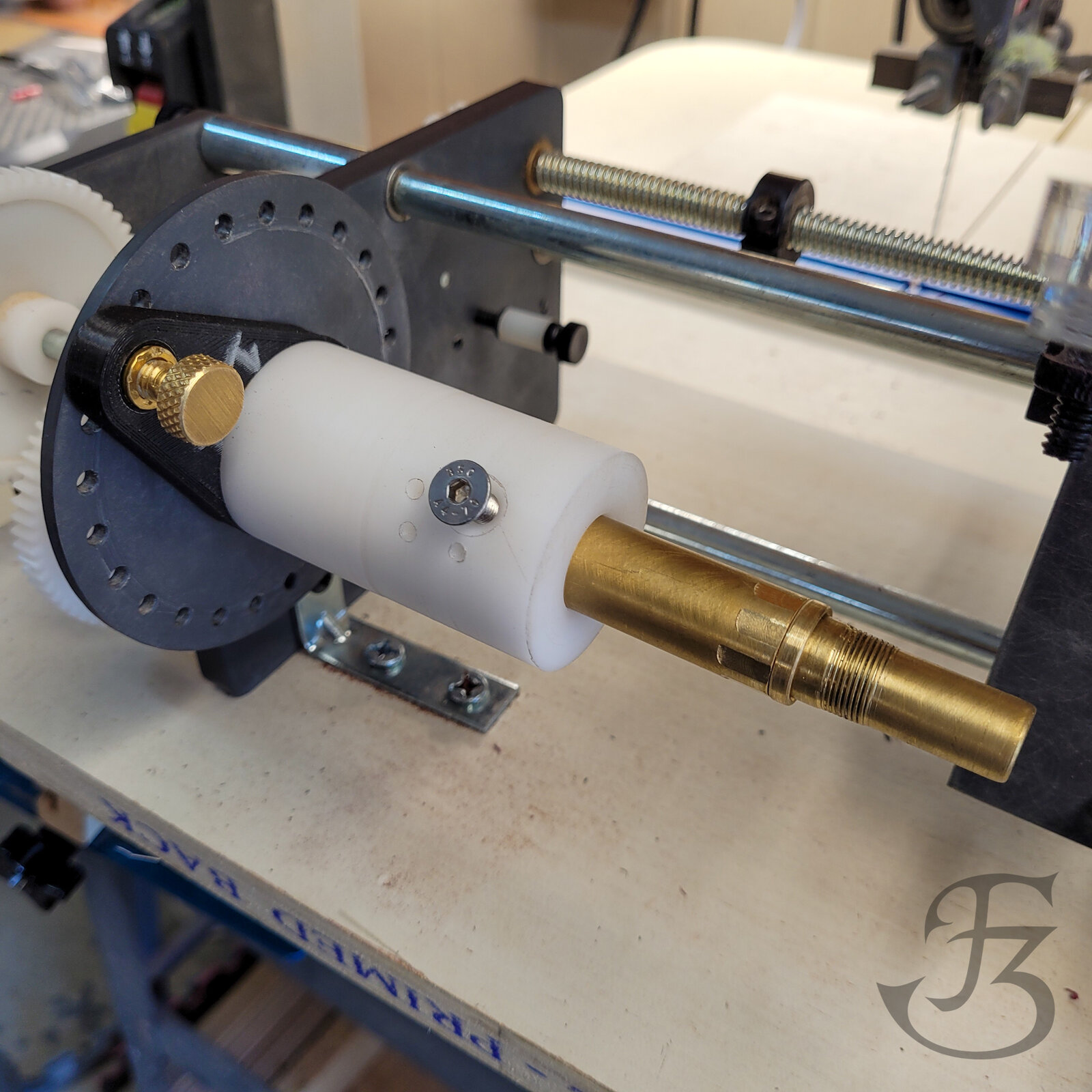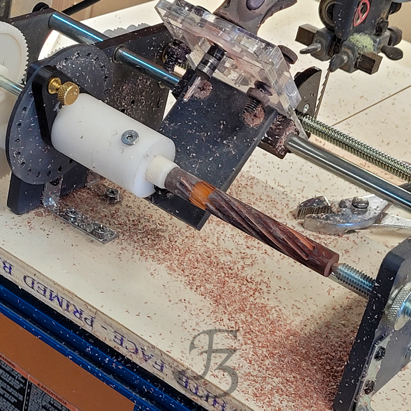 3D printed base plate with a delrin cartridge. This one accepts 5/8" custom mandrels which is my standard size mandrel so I can swap in and out for different parts as needed. Just leave the stock long enough for a center drill for the tailstock support and turn it off at the lathe when you're ready.