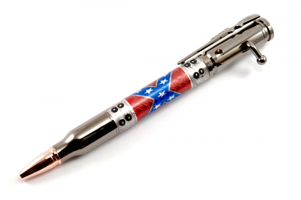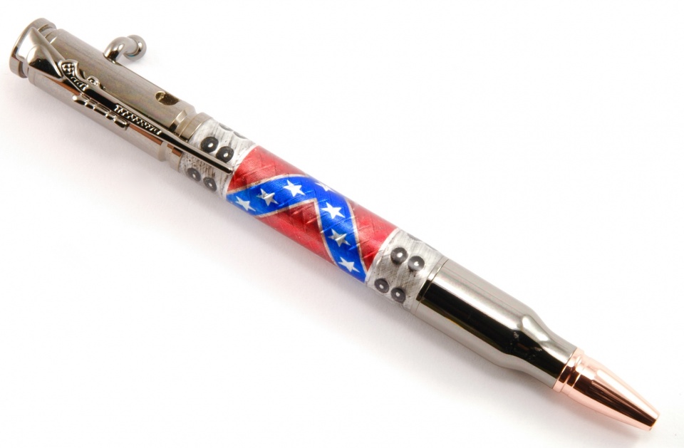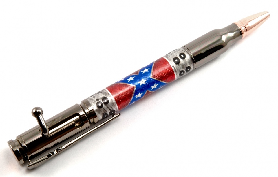 This is another Tube-In design from my "Hybrid Steampunk" selection. It's made with boiler plate caps, simulated rivets and embossed aluminum background with an over-layed Confederate Flag. Pressure cast techniques and premium Alumilite were employed!