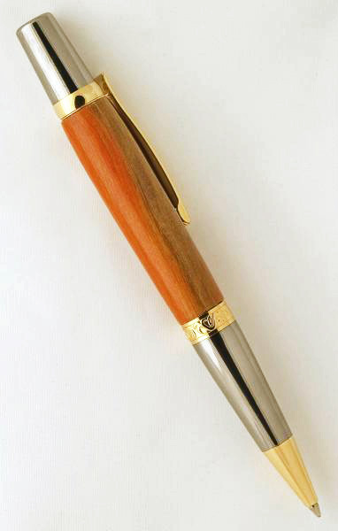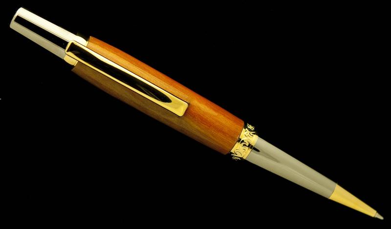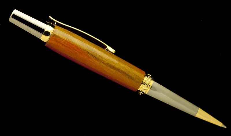 Made it this A.M. It's Conkerberry, a kind gift from Peter Hay aka pwhay, on a Black Ti/ Ti Gold Elegant Sierra. The wood is from Central Australia. It's orange and brown and very distinctive. Looks more defined as far as the colors in person than in the pictures. Comments welcome but most of all thanks for looking. Doc:smile: