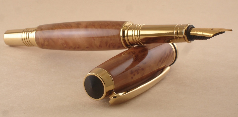 Ti/Gold Jr. Gent II fountain pen dressed in Coolibah Burl with medium 5MM Bock nib. Finished using my Rustoleum OMWB poly dipping method.