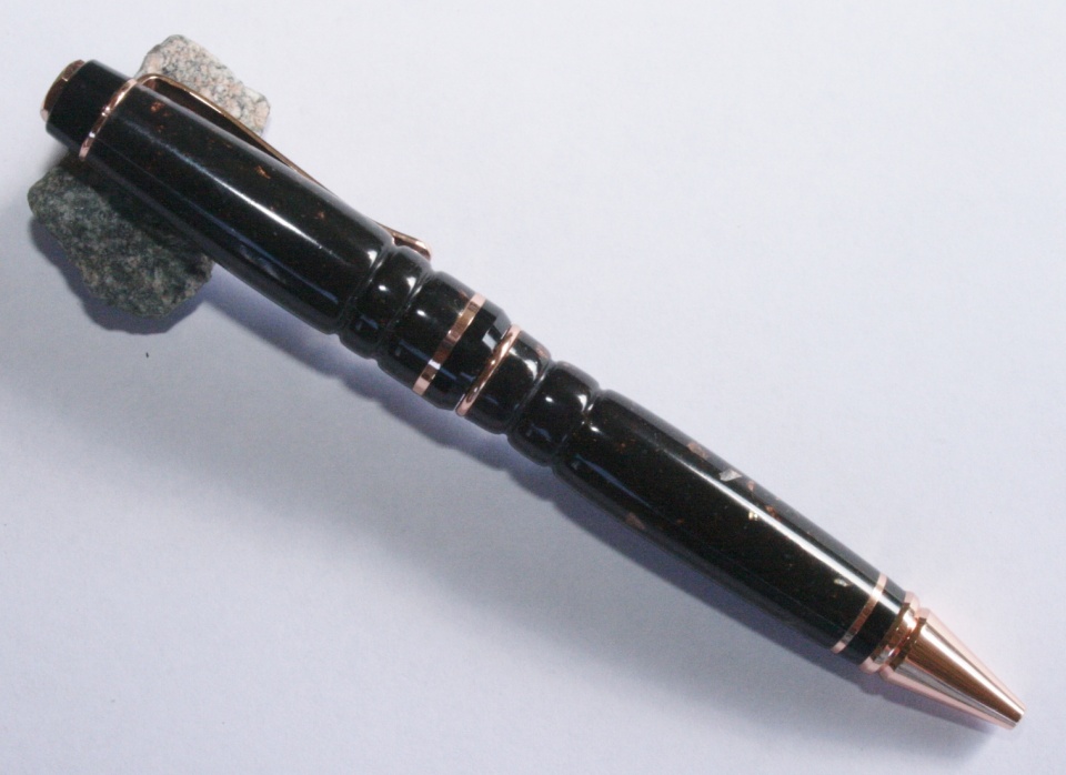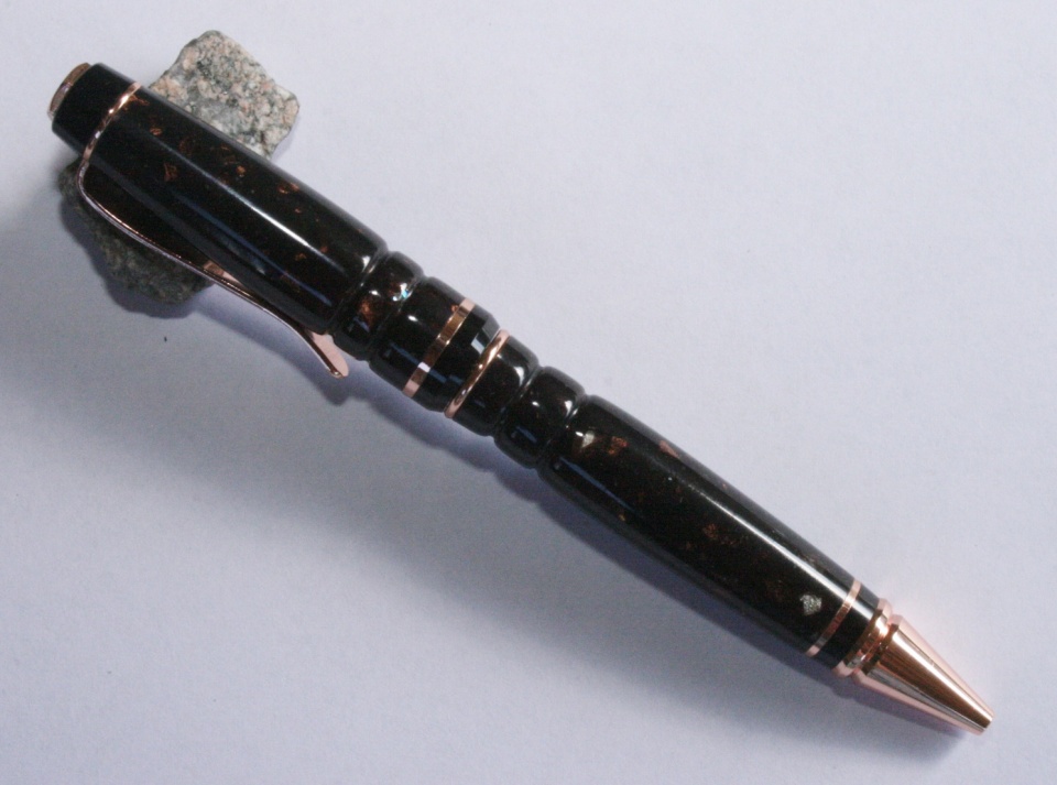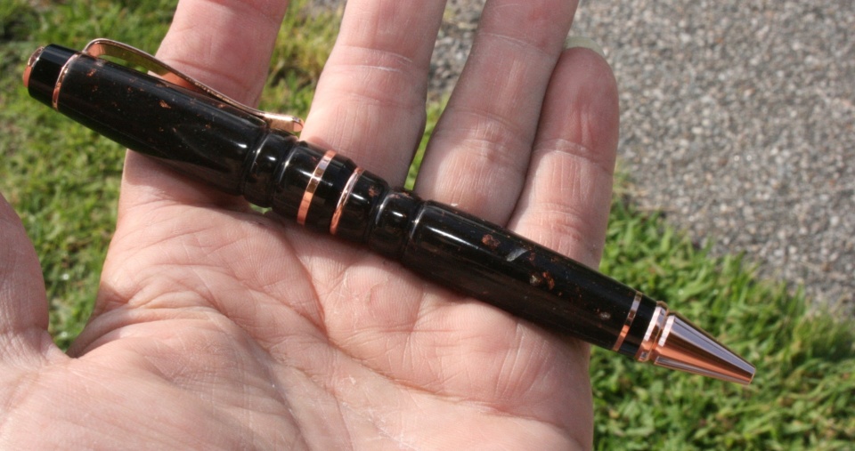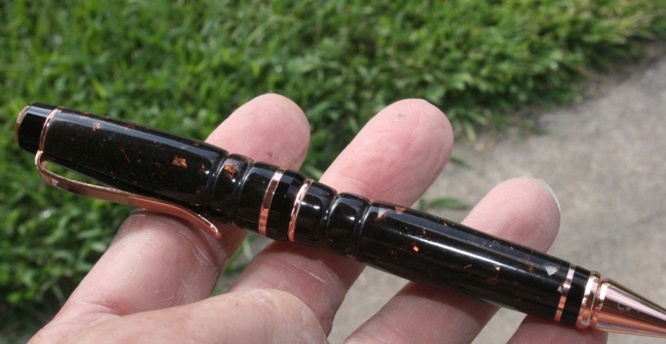 I used 2 pieces of 1/2" Corian glued together with thin CA. The gold in the blank has some open areas around them..I blanked painted the blank silver so the brass tubes would not show through...this gave a really neat effect filling in the open areas around the gold. I wet sanded the blank to 12000 MM and polished with Hut plastic polished. Evelyn paired the blank with the copper kit. All C & C are welcome
