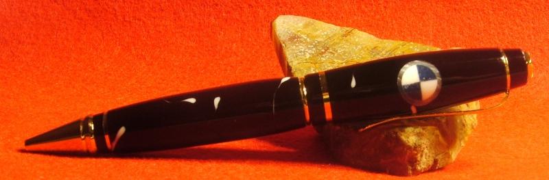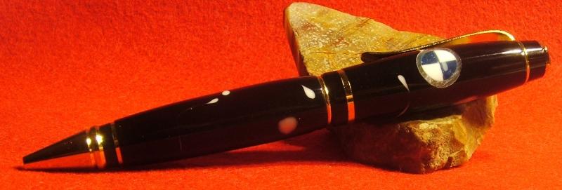 My friend asked if I would try to do the B M W emblem for him on a pen, SO I split and quartered a white blank and a blue blank and used CA to put them back together. Then I turned it down and put it in to a silver crushed velvet blank, and that in to the black and white (very little white) blank. It was sanded and polished to 12,000 MM.