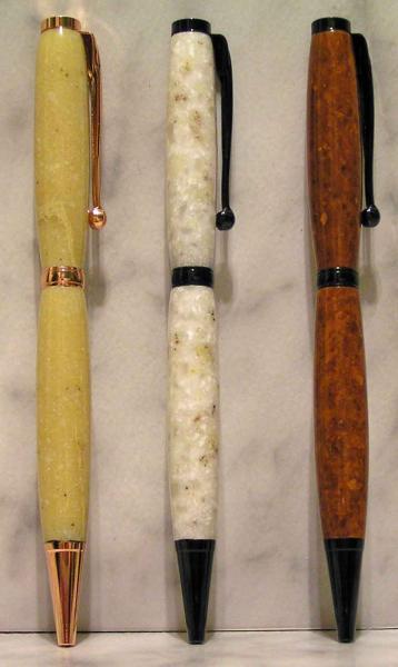 I like corian for slimlines and comfort pens. It was the first non-wood material I turned. I found it very easy to turn. It makes great pens with no finish (other than sanding) required.