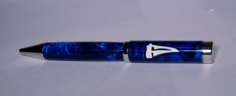 Second is a hand scrolled sailboat blank by Jeff Powell on a platinum Atrax. This is a gift for my brother in law who likes to sail. These blanks turn very easily and the depth of color is fantastic. You just have to follow his guidelines on drilling the blank and things turn out pretty well.