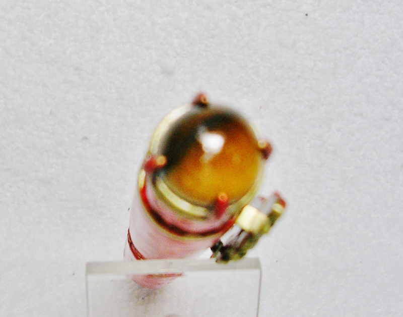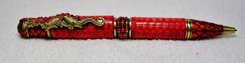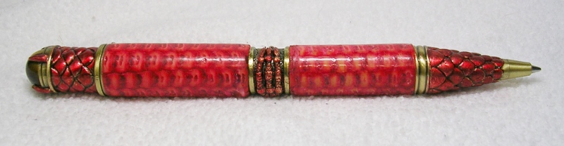 This is another PSI Dragon Twist Pen kit in 24K Gold fittings and Tiger's Eye final. I have again added a alcohol dye/ink to the scales, claw, talons, and dragon. The blanks are corn cobs I had the Blue Jays remove the kernels from for me. These I also tinted with the red Alcohol dry/ink and added a blender to soften and even the color. The finish is 8 coats of thick CA in order to fill all depressions, sanded with 240 and 900 grit, than a coat of One-Step Plastic Polish. As you will notice in the front horizontal view, the blank is not level with the ring, yet on the back view, it is. I have put 5 of these pens together so far, and every one has not seated properly. If you try to straighten it, you will snap the threads off. I have used 5 different methods of inserting the center band and all have the same results. Any suggestions ?? I am not pleased with the finished results of this pen, but it is for my display and use, and would never be given away or sold. Jim S