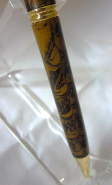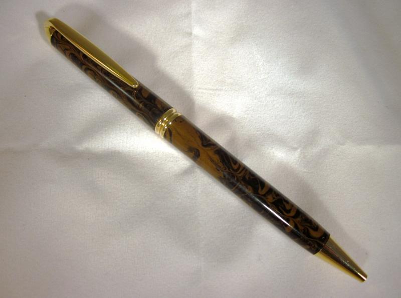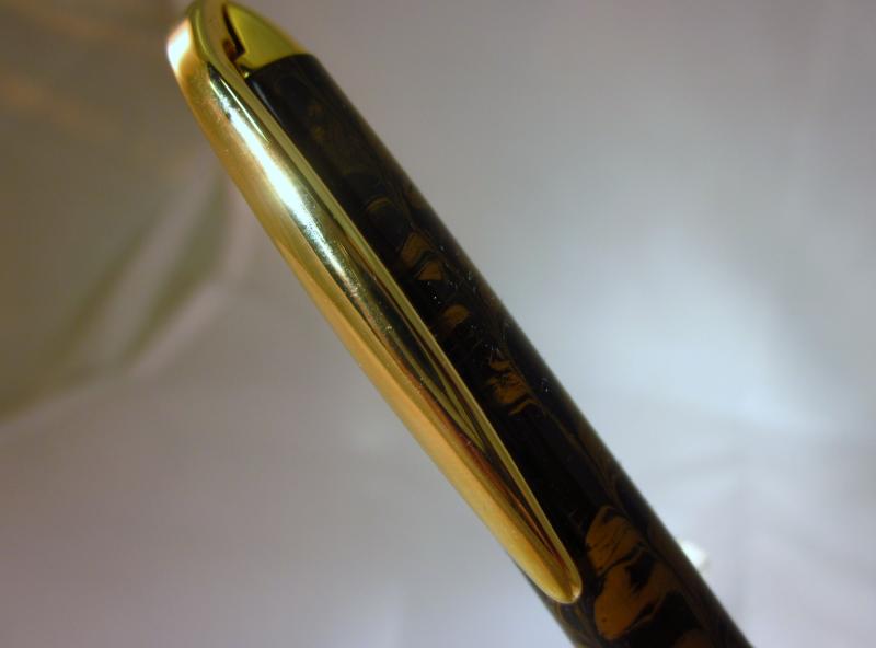 The slim pen is a Presidential from CSUSA. I haven't really looked at ballpoints for a long time, and like I said, I needed a change. So for this one I concentrated on getting the shape just right--the tapers at the ends. I think this Ebonite is cool, but I don't think I like it in gold as well as I would rhodium--it's just the Presidential only comes in gold. The clip is different--spring-loaded.