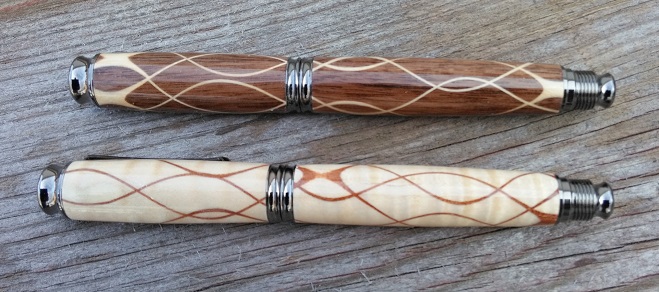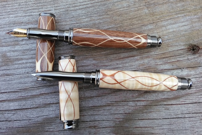 These 2 have my serpentine blanks. Curly Maple with Mahogany and Walnut with Maple. One roller ball and one fountain pen. Going to try selling them as a set.