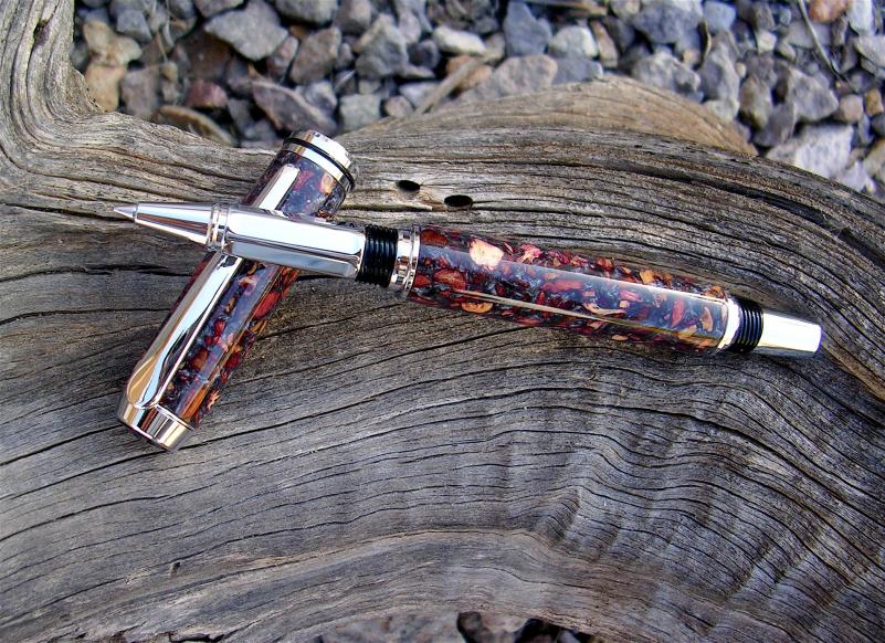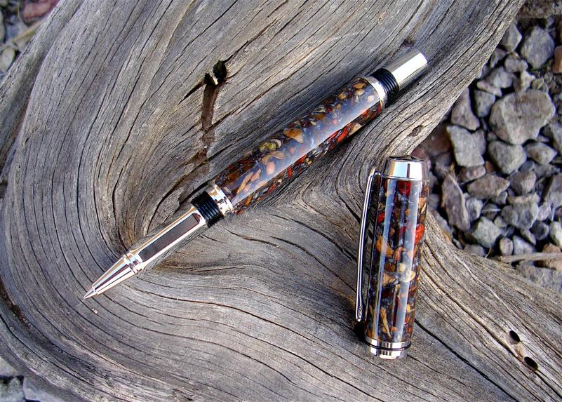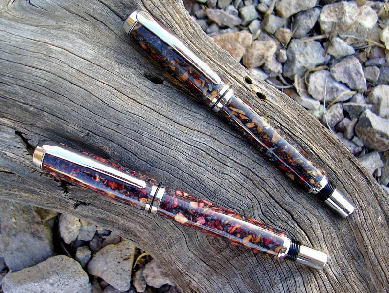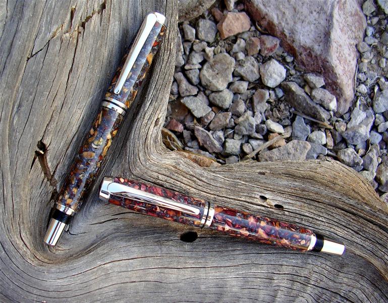 Those are very interesting and very nicely done. Using the chips of amboyna was a great idea and keeps some beautiful wood in circulation instead of in the junk box. Really nice pens great job.