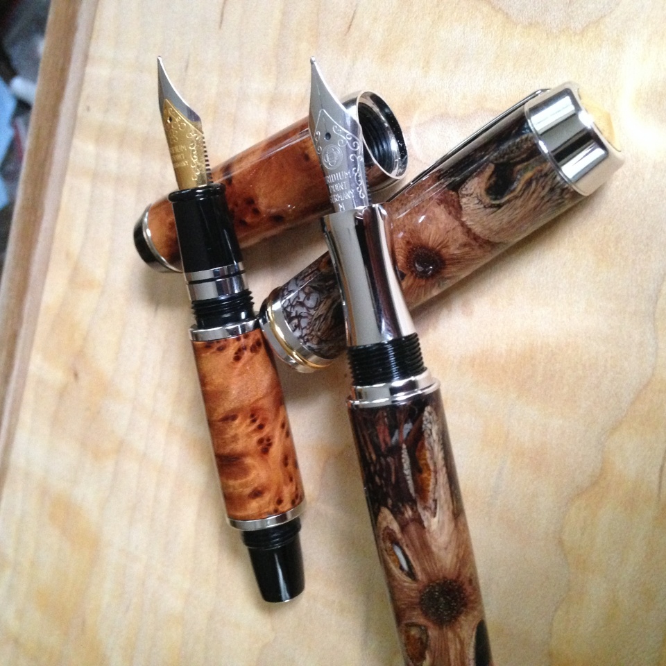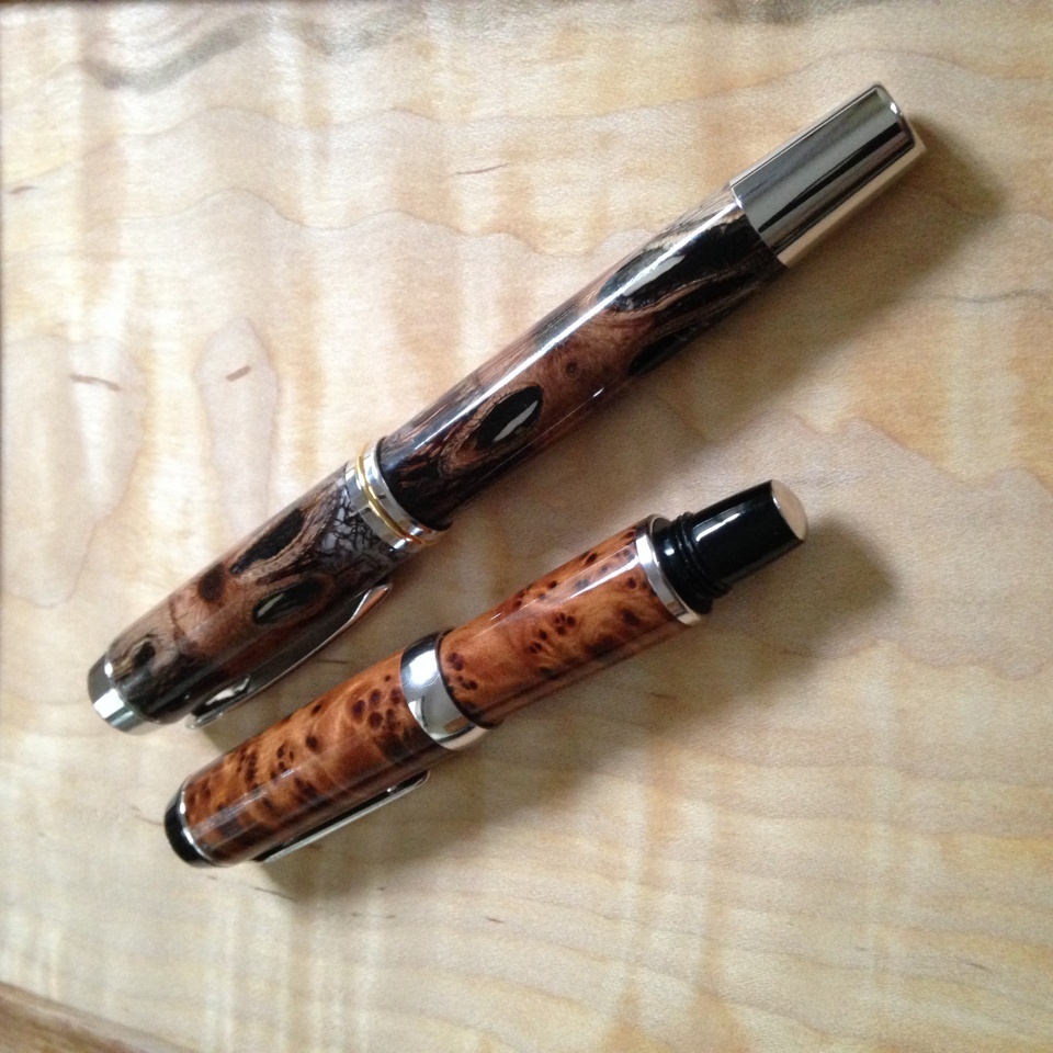 Managed to finish these two fountain pens yesterday, both on the "fat side" but quite obviously of different size. El Toro fountain in thuya burl, rhodium Gentlemen fountain in stabilized banksia hairy pod, both with CA finish. The stabilized banksia hairy pod is from George's bits of timber, purchased with the gift certificate for winning the "pretty wood contest" for the summer bash