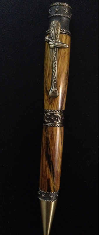 Antique Brass components. I used yellow dyed, stabilized, Spalted Tiger Oak for the timber.