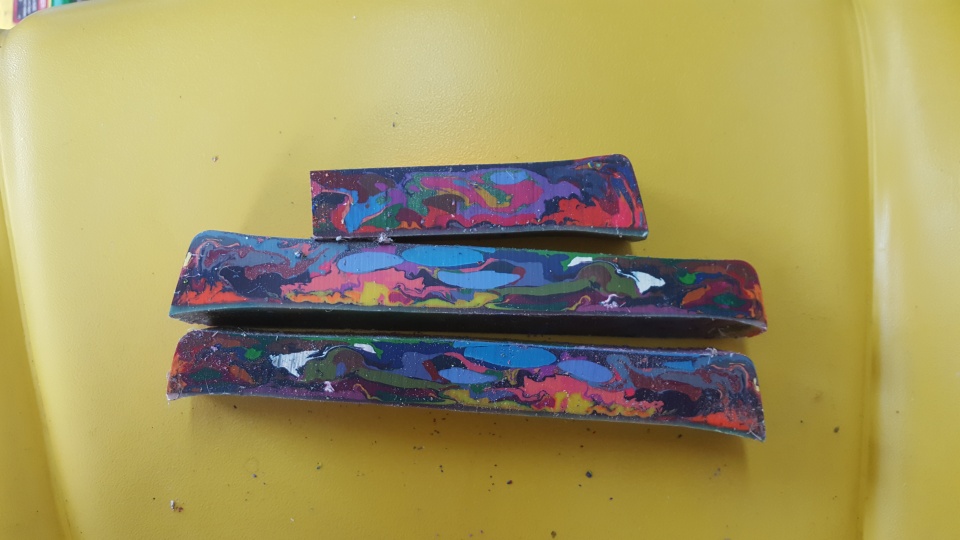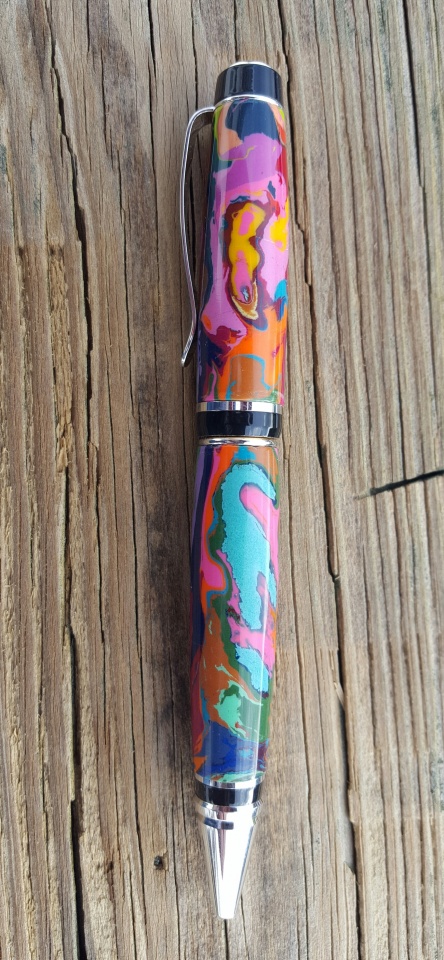 Crayons melted down and cut into a blank. Turned and have a CA finish. I noticed on the back side there is some "chip out" on the ca finish. I tried on some samples earlier and the best technique I found was spray the pen with activator then apply a coat of thin CA, do this about 5 times then I switched to 4 or 5 coats of thick CA.