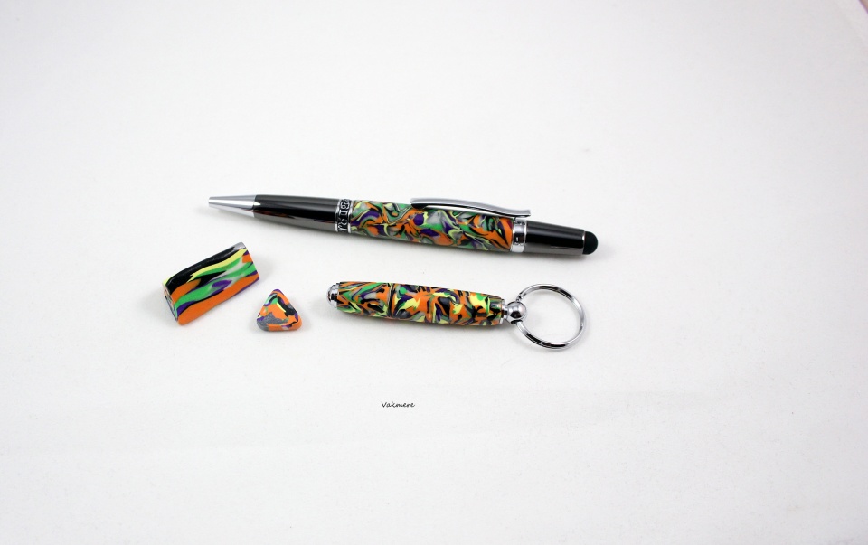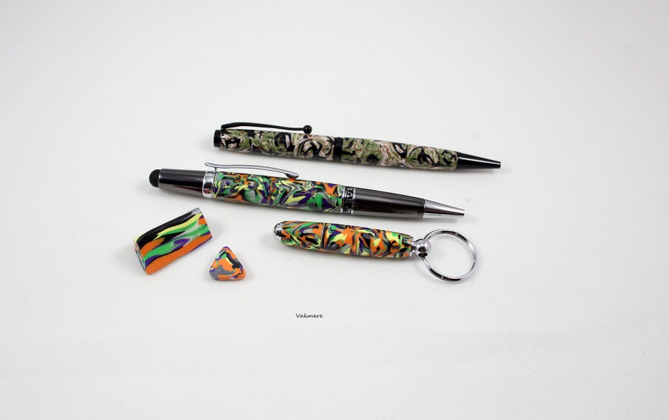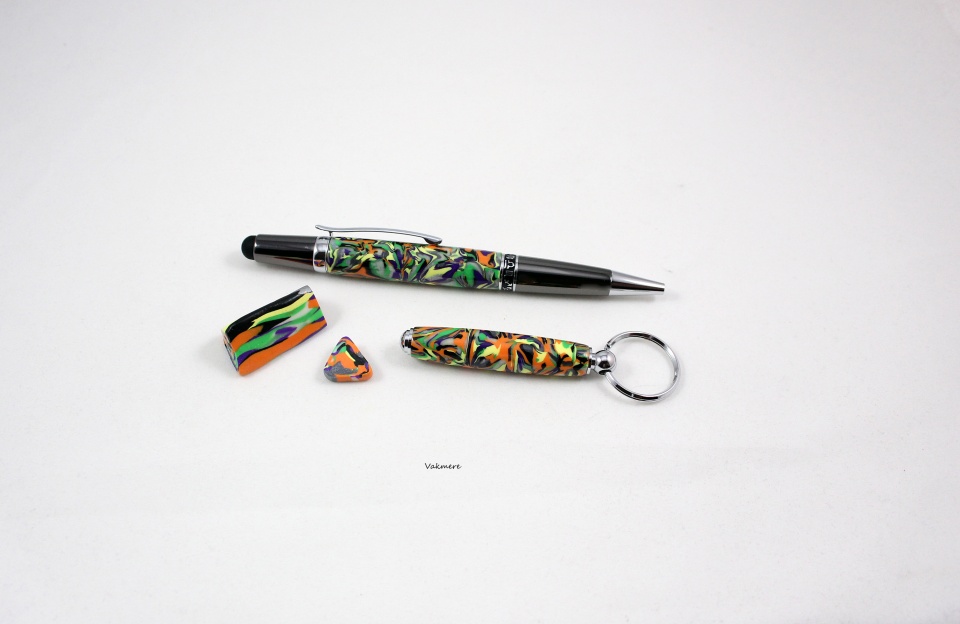 Have a Michaels coupon? 1/2 off, drive over there, grab a bunch of different colors then go at it. Seven colors - Orange, black, white, plum, green, yellow, and silver. An electric pasta machine makes it easier. This time I broke all the colors into fingernail size pieces then rolled them into a ball. Compacted it, roll it out, shape into a triangle, slice, then moosh it all onto pen tubes. Pen and key ring. Next option is to slice the triangle long ways then press it on a tube to get long lines for a different effect. Lot of work but the results are interesting. The twist pen was not from this batch, left overs from a camo thing so I threw it in there. Last photo is the rig I use to install the clay. 1/4x20x6 bolt, 1/4" nuts and fender washers, and the bushings for the component set I will be using. Keeps the clay off the baking pan. For trimeline/slimline twist pens I use an 8" 1/4x20 bolt and the bushings for that. Build up the CA 15 to 18 coats, sand with MM, polish, install. Use accelerator after the 4th coat. C&C welcome. Enjoy......