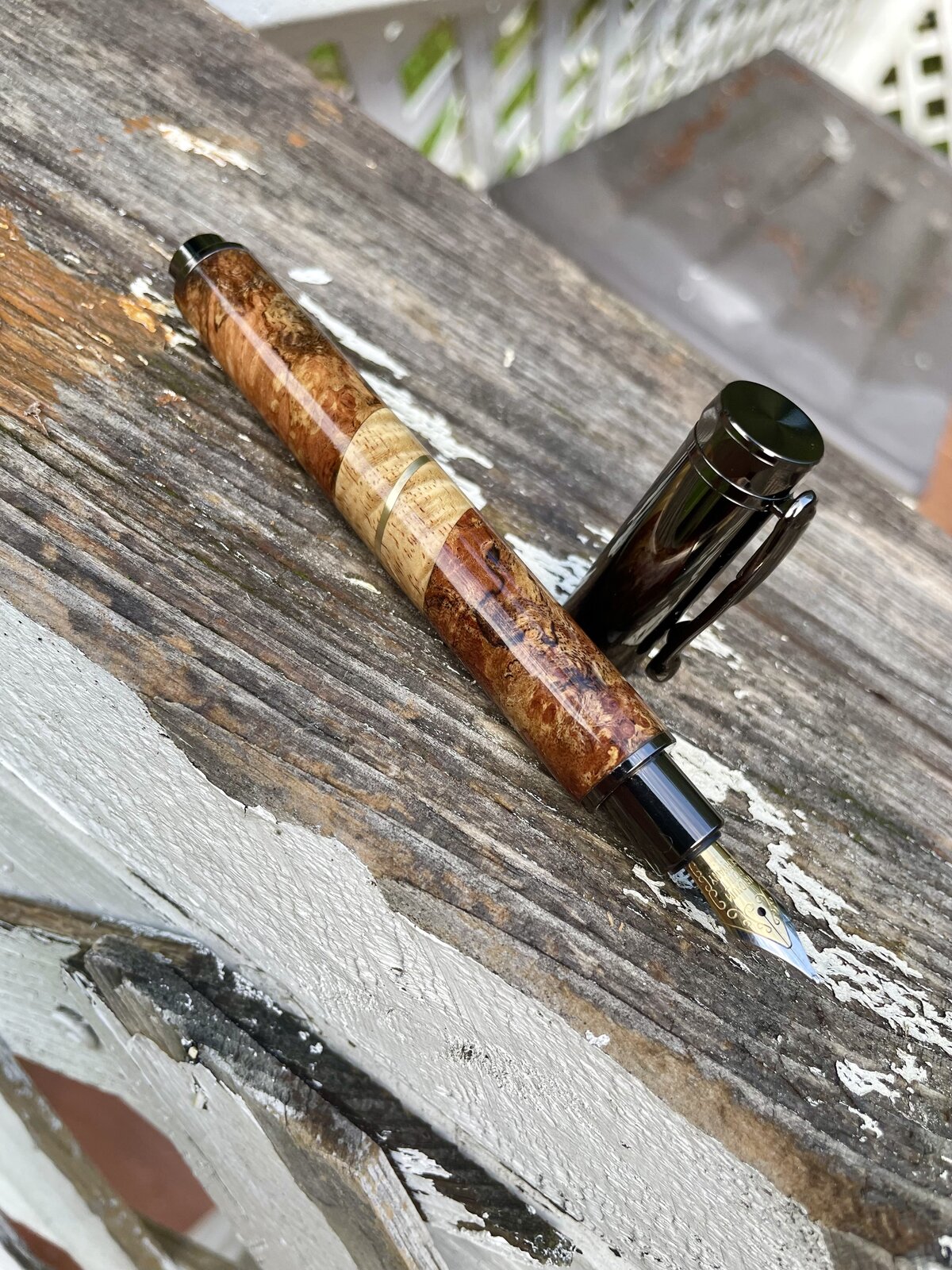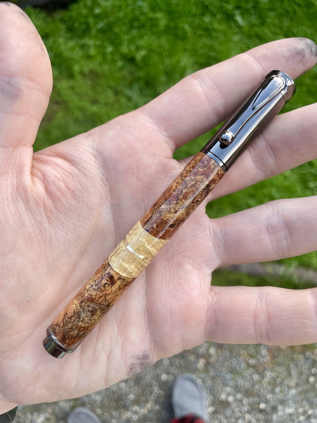 In 1741, a one-of-a-kind man known as The Dread Pirate Roberts took a piece of Carribean Rosewood Burl from the scrap pile of the shipyard where his ship had been built. He kept a small piece of it with him during his sailings until he came across an island we now know as Hawaii, where he also found trees with rich brown wood that compressed to form beautiful "curls", known as Koa. After a long career of 268 years (he had a very healthy diet and active lifestyle) I ran into him on a cruise with my family and we had a drinking contest on St Thomas island. After I won handily (I was 16 so we opted not to get video evidence as I was below the drinking age) he surrendered to me both this piece of CRB and Koa as well as his finest pistol. I used the baseplate of the pistol grip for the brass portion of the pen, because I know that would have irritated him.