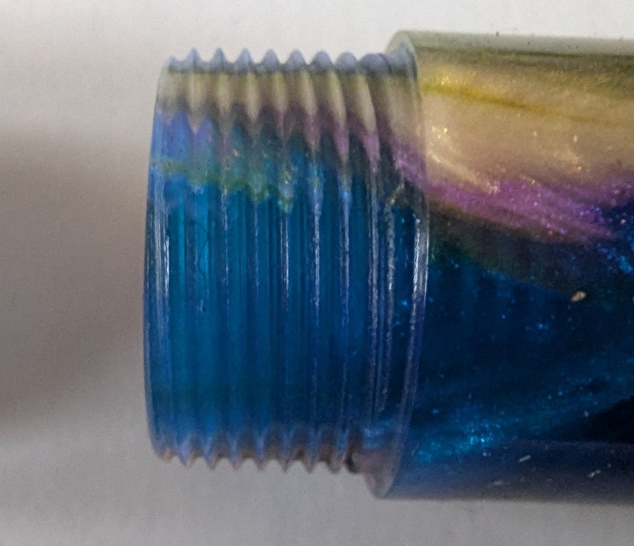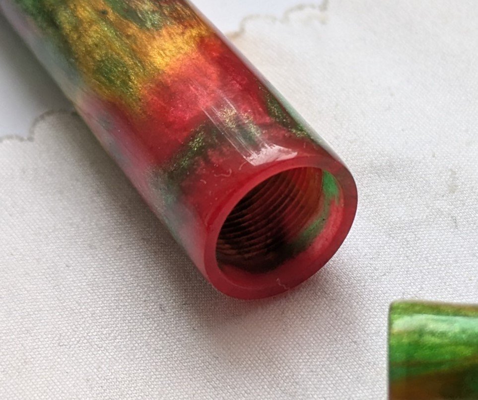I've expanded two of the photos for the red/green pen to see if that helps at all. I've seen some pens where there is a definite 1-2mm lead on the body with no thread on it. I presume this is at the minor diameter of the thread. Is that what I should be aiming for or is it enough to just round-over or chamfer the start of the thread?
