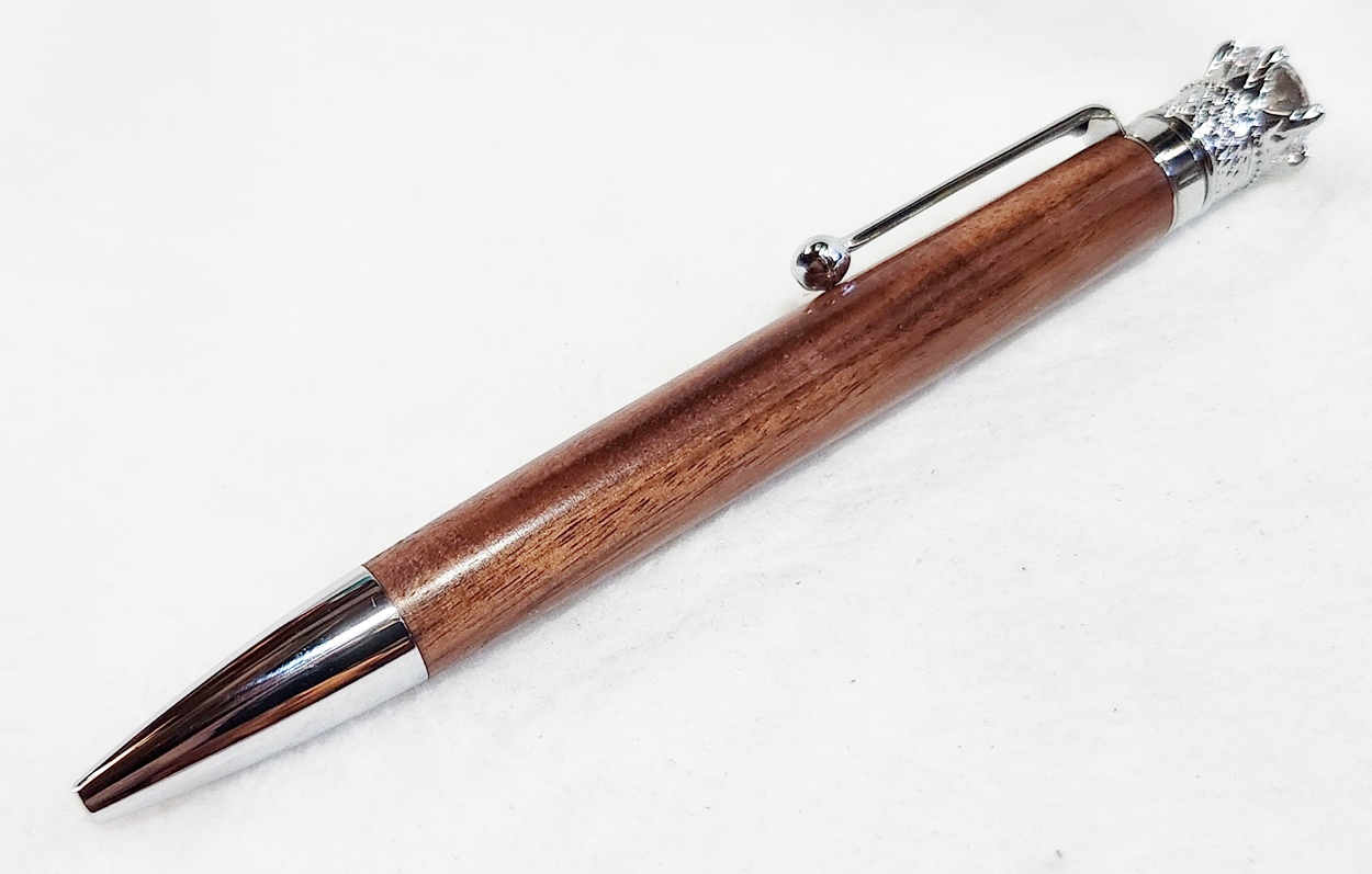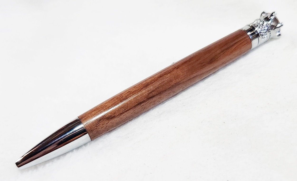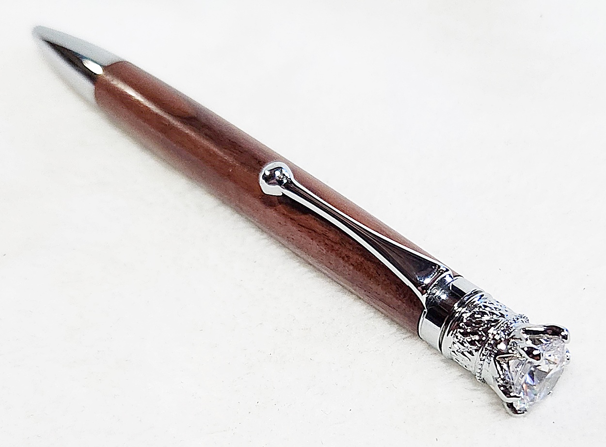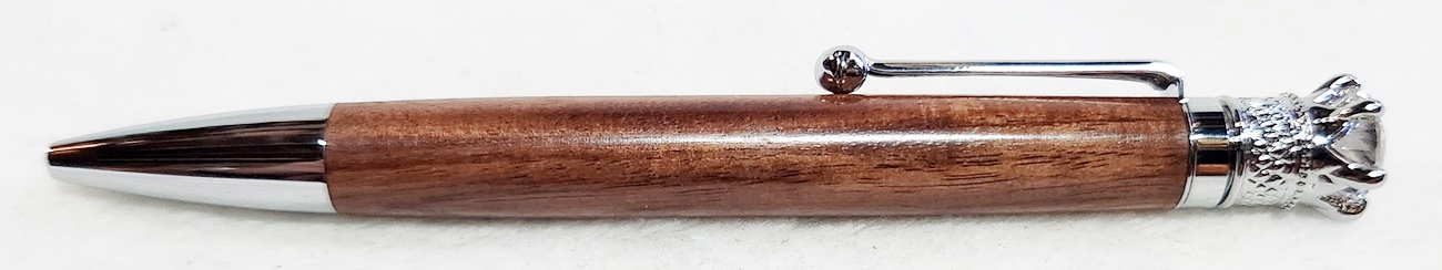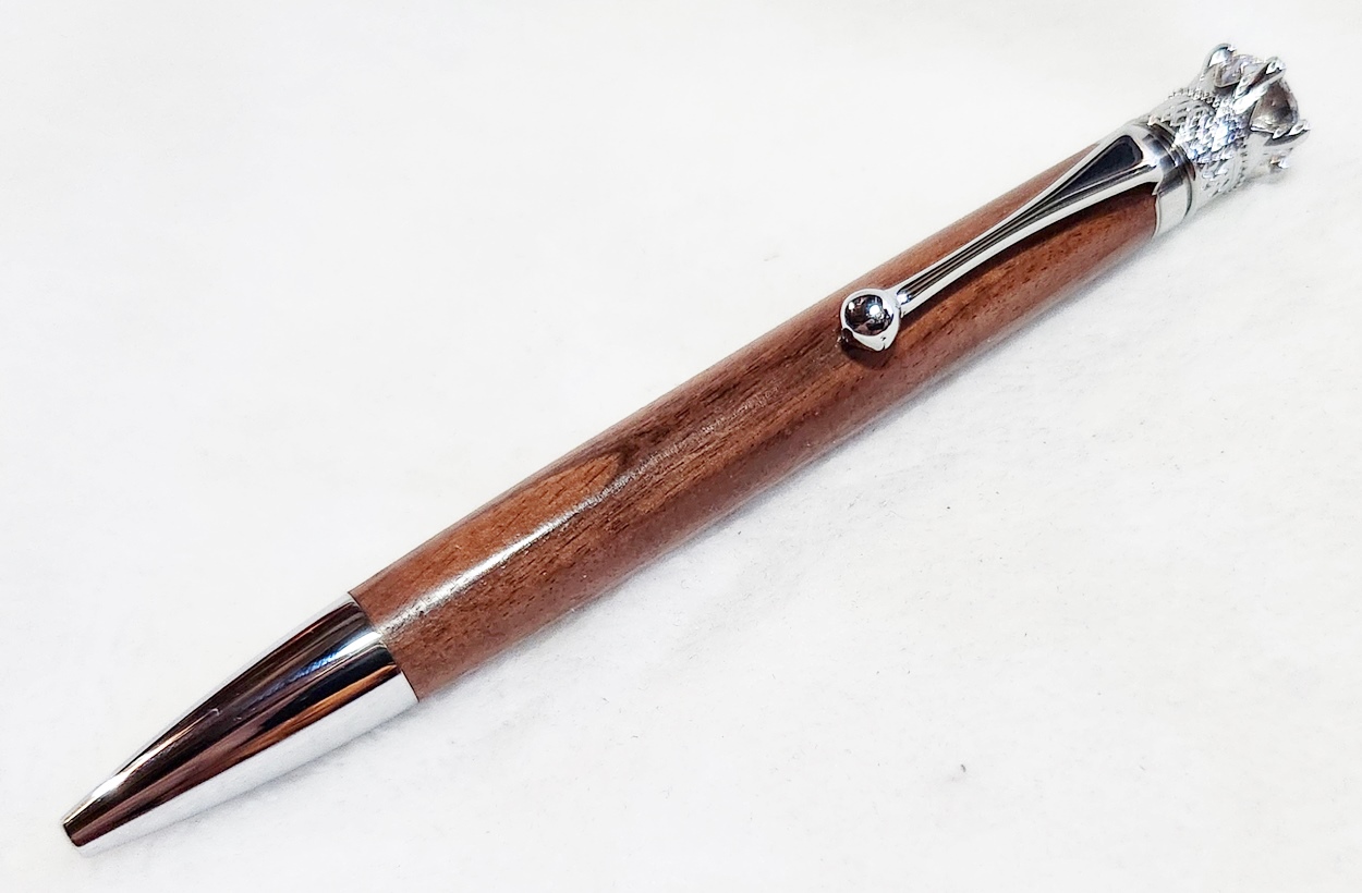 This is a Crown Royal twist pen in chrome, from PSI. The wood is Bolivian rosewood. The finish is Pens Plus.