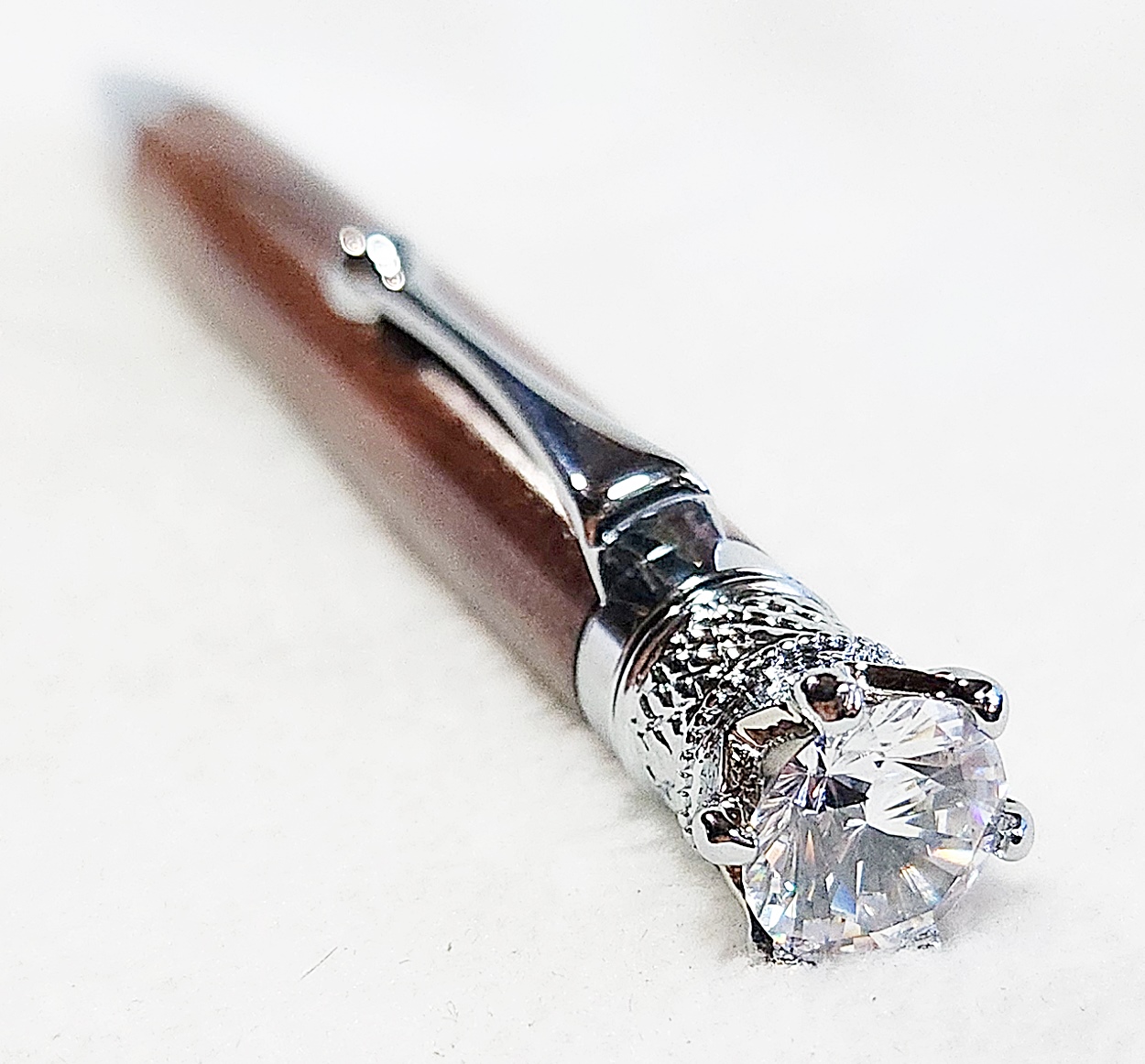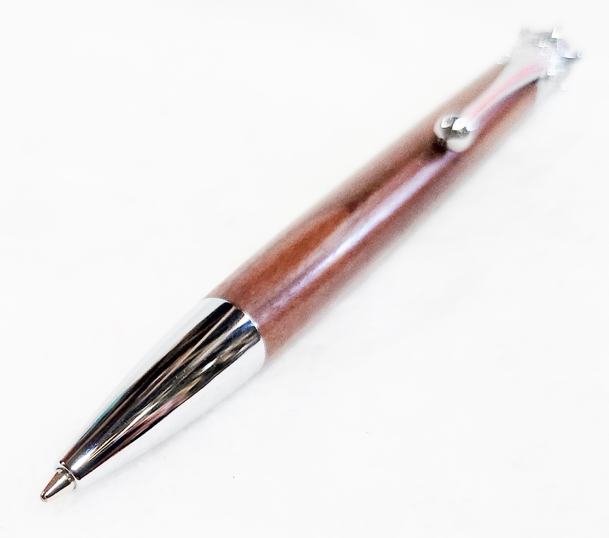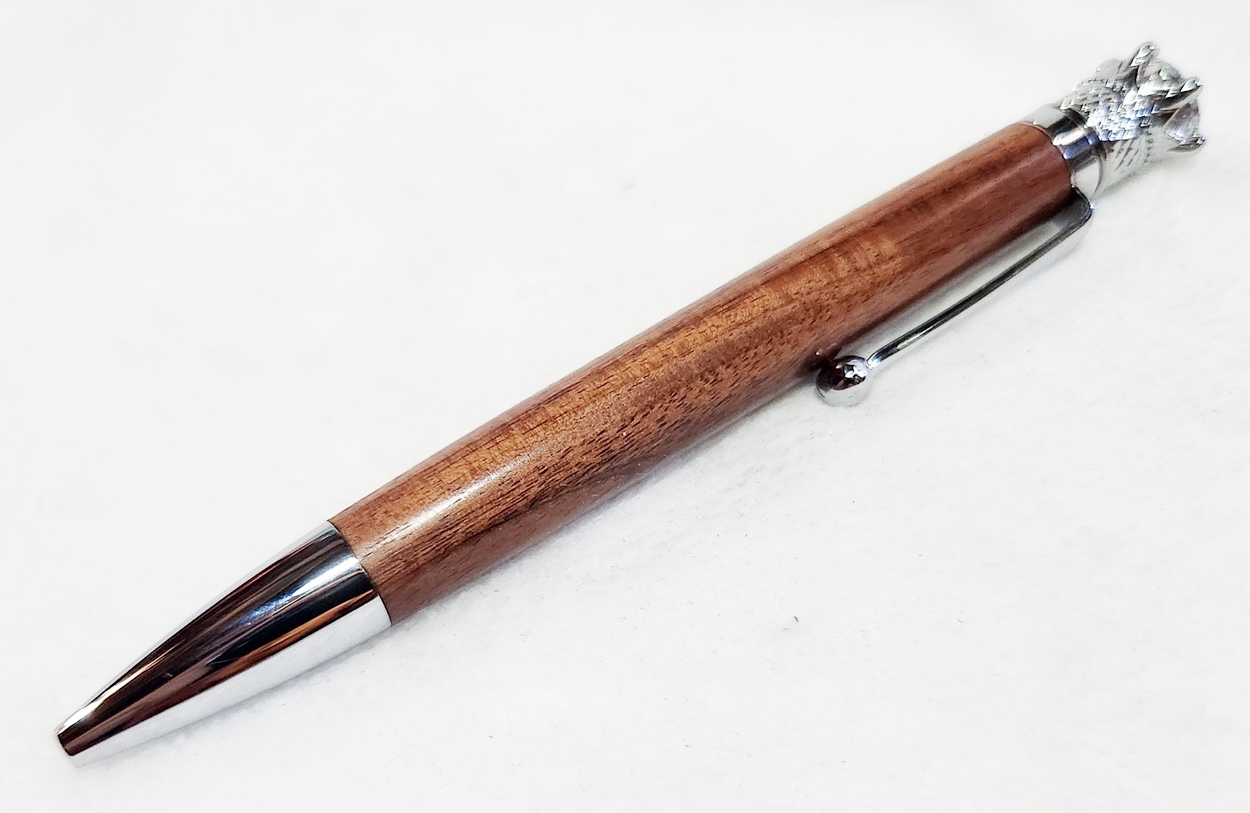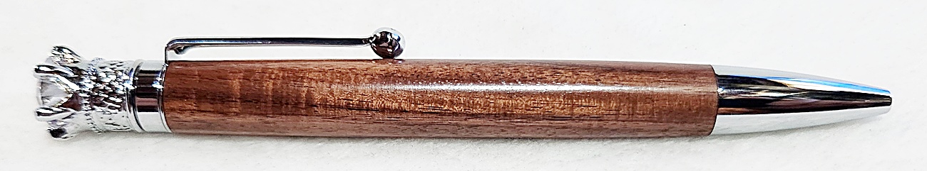 This is a Crown Royal twist pen in chrome, from PSI. The wood is Bolivian rosewood. The finish is Pens Plus.