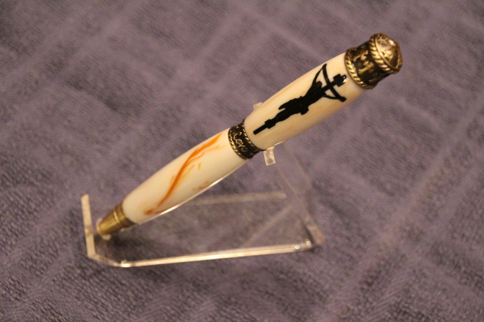 I wanted to make my wife one of the Faith, Love, Hope pens from PSI. Cruising the exotic blanks site, I came across the Crucafix rotacrylic blank under their Guest Artists' blanks section (MasterScroller Artworks) and thought this would be the perfect blank to put on this pen kit. I was a bit comprehensive about the blank working as it says it's designed for a midsize kit (Jr. Gent II, etc.). After checking and finding that the bushings for this kit are only very slightly smaller than the bushings for the Jr. Gent II I decided to give it a shot. I think it turned out pretty nice. The length of the top tube cut it a little close but it worked out and the wife is happy with it.