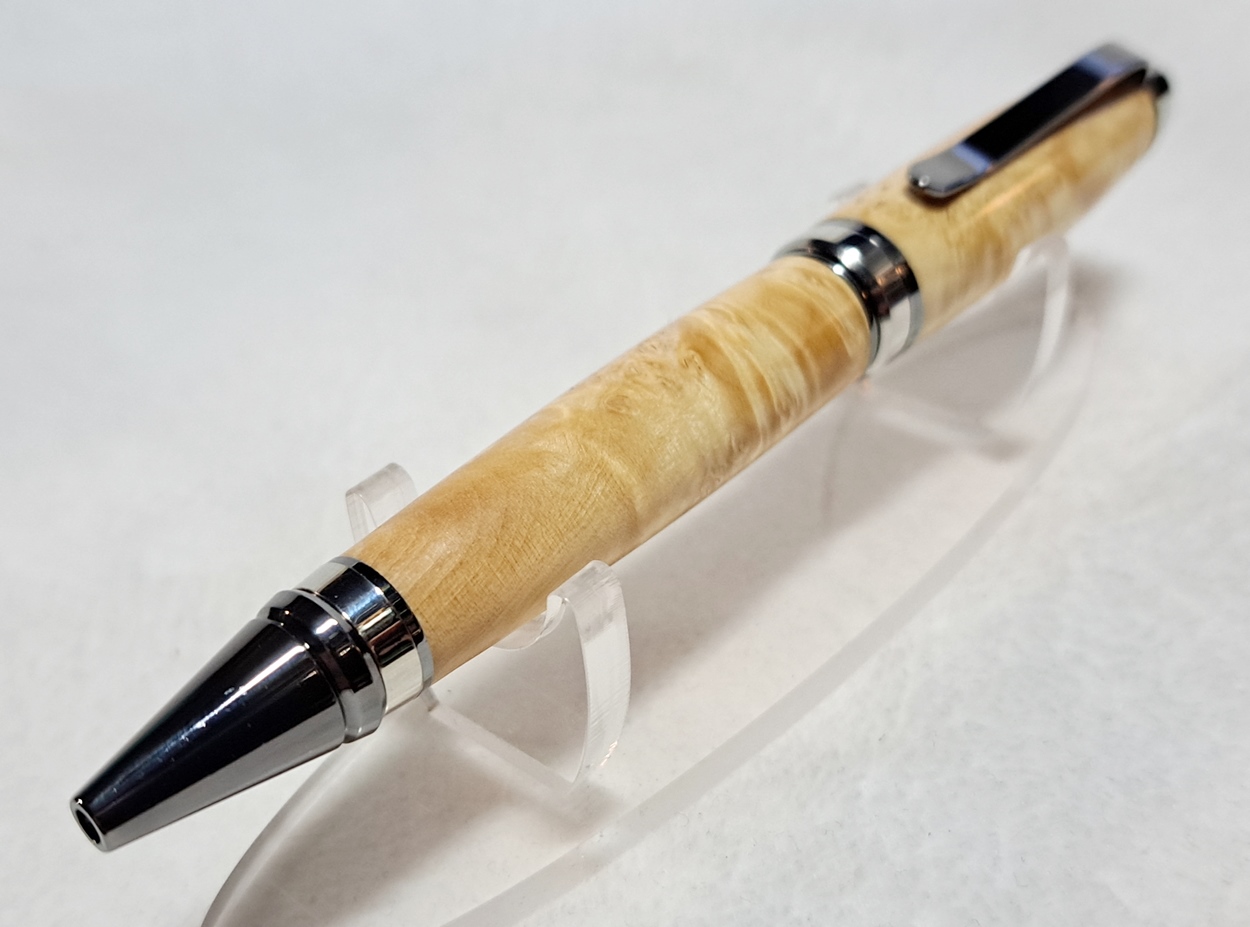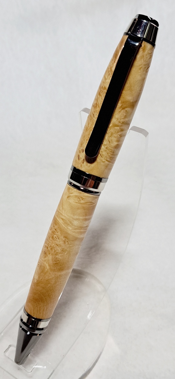 This is a Cuban (Cigar) from Rockler in platinum. The blank is a stabilized boxelder burl, also from Rockler. Pretty spectacular grain. There must be a lot of resin in it, it smelled really bad during drilling and turning. I finished it with Pens Plus.