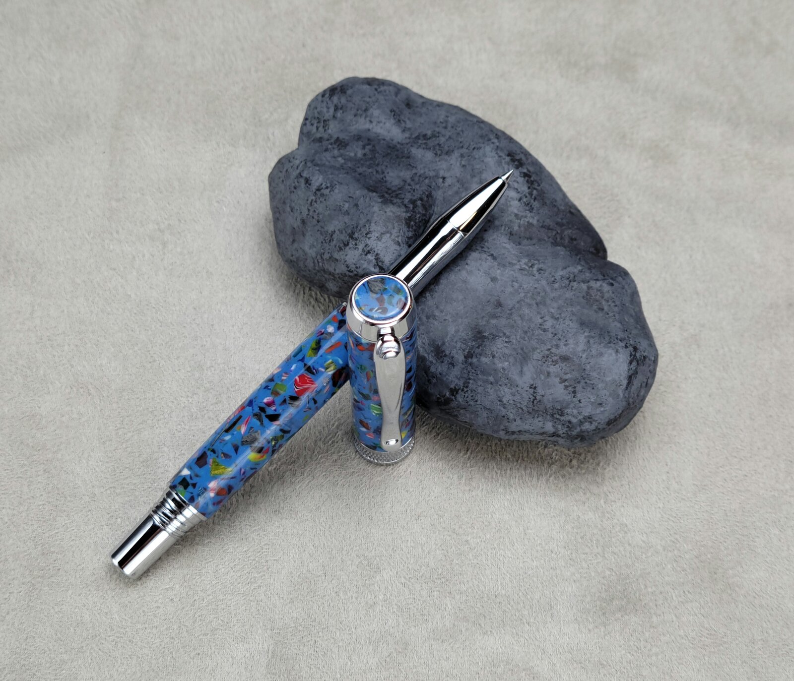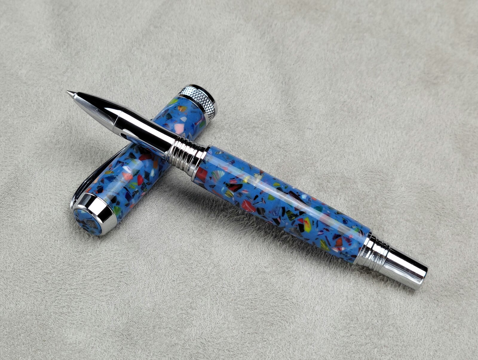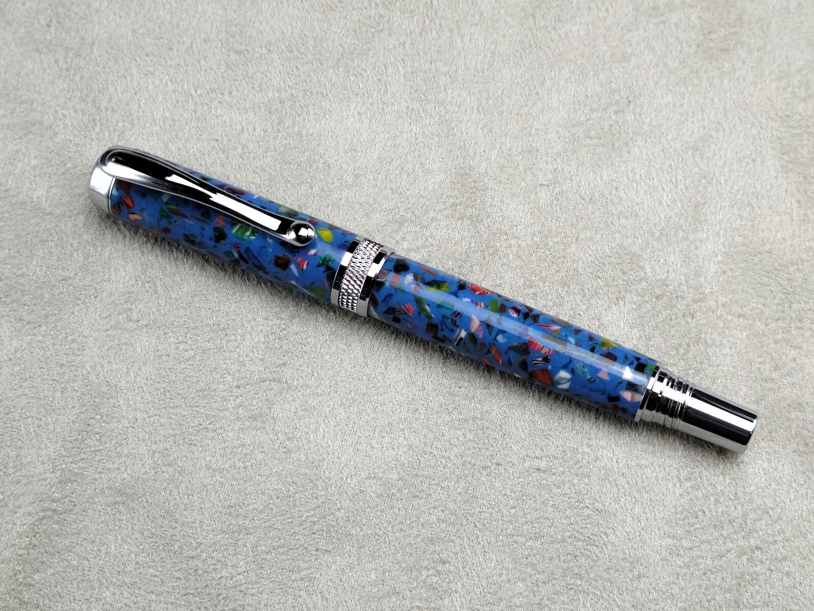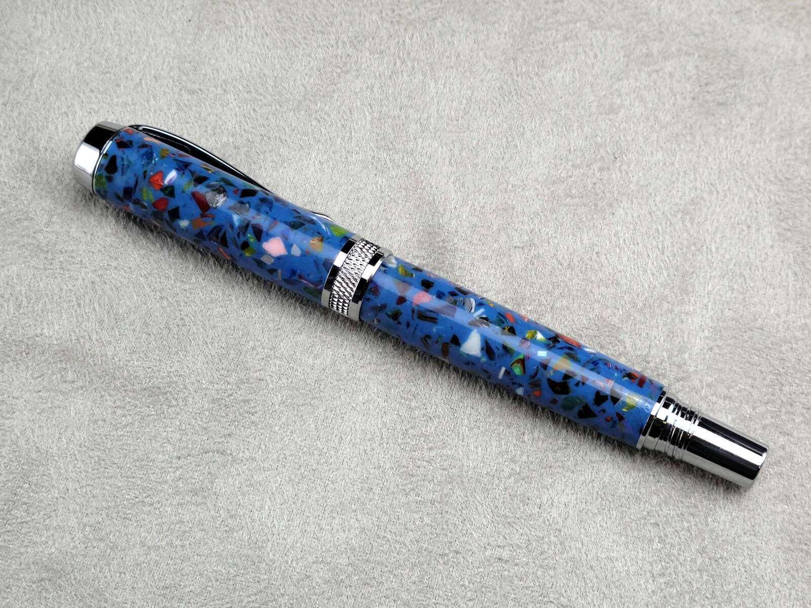 The kit is a chrome Diamond Knurl. The blank is "Independence Blue Kaleidoscope" from Stadium Blanks. I guess the chips are a couple different resins, but the main pouring material is JB Royal resin. It cut really smoothly. With it being mixed materials, I wasn't sure how the polish would hold up, so I put some CA on it. This is 3 layers of GluBoost medium and 2 of thin, then wet sanded/polished through the zona grits.