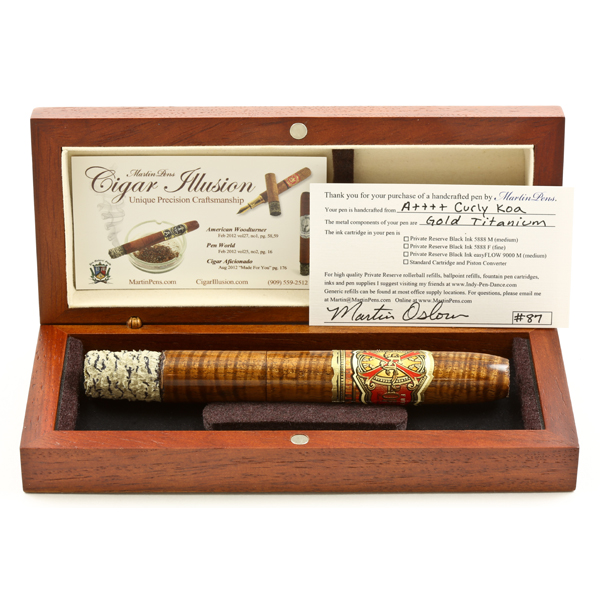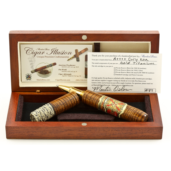This Cigar Illusion is made from A++++ Curly Koa. This is the highest quality Koa I have worked with. It absolutely needed an OpusX band. Enjoy