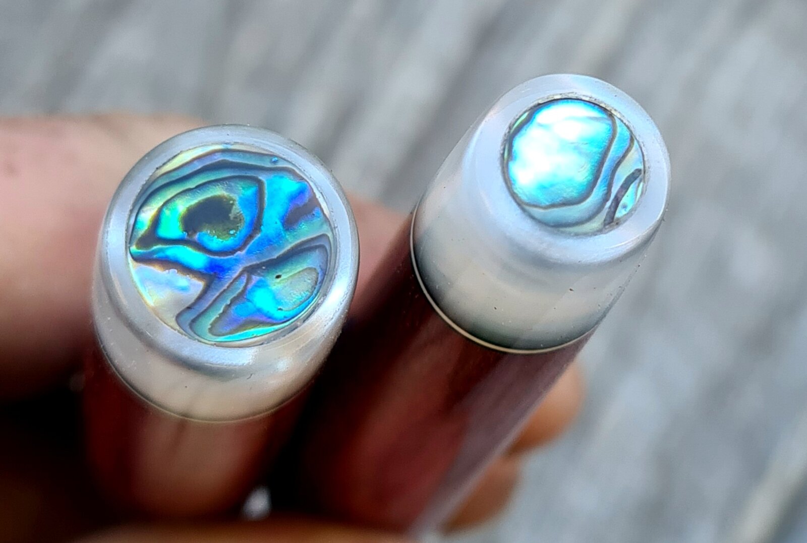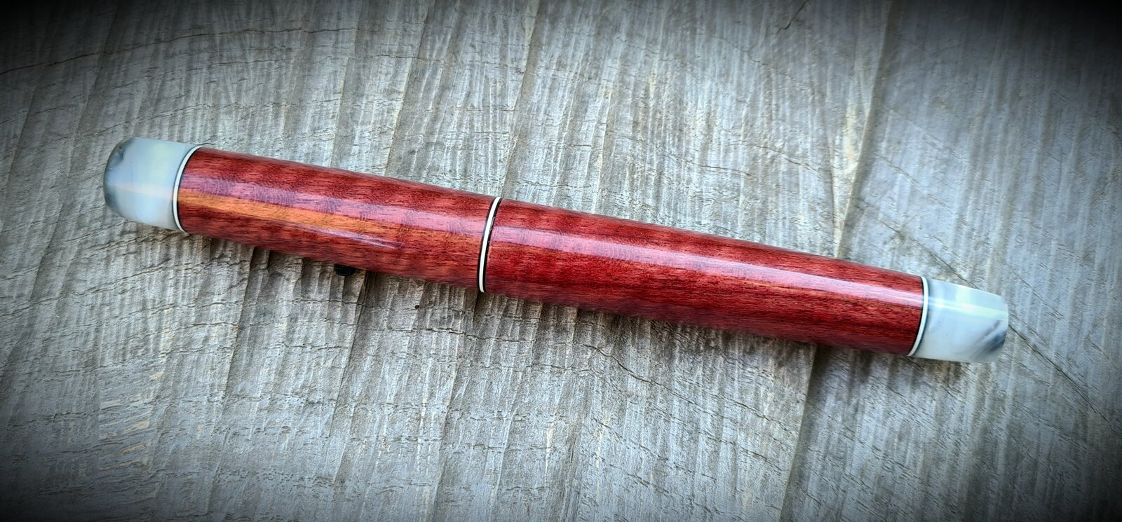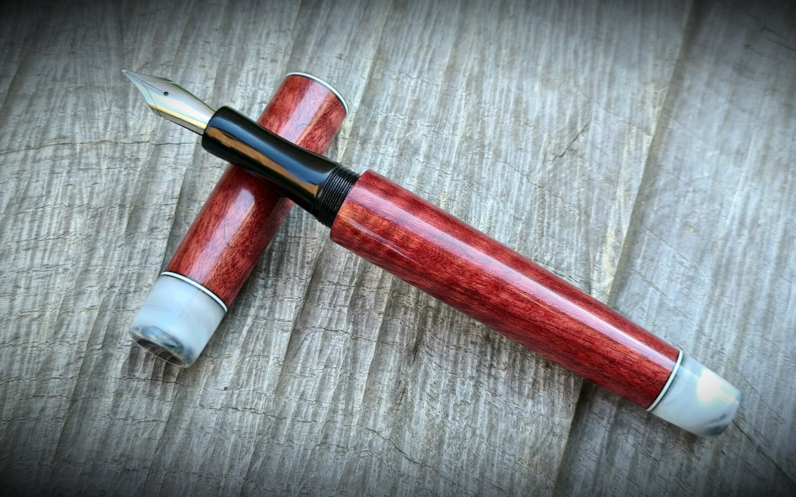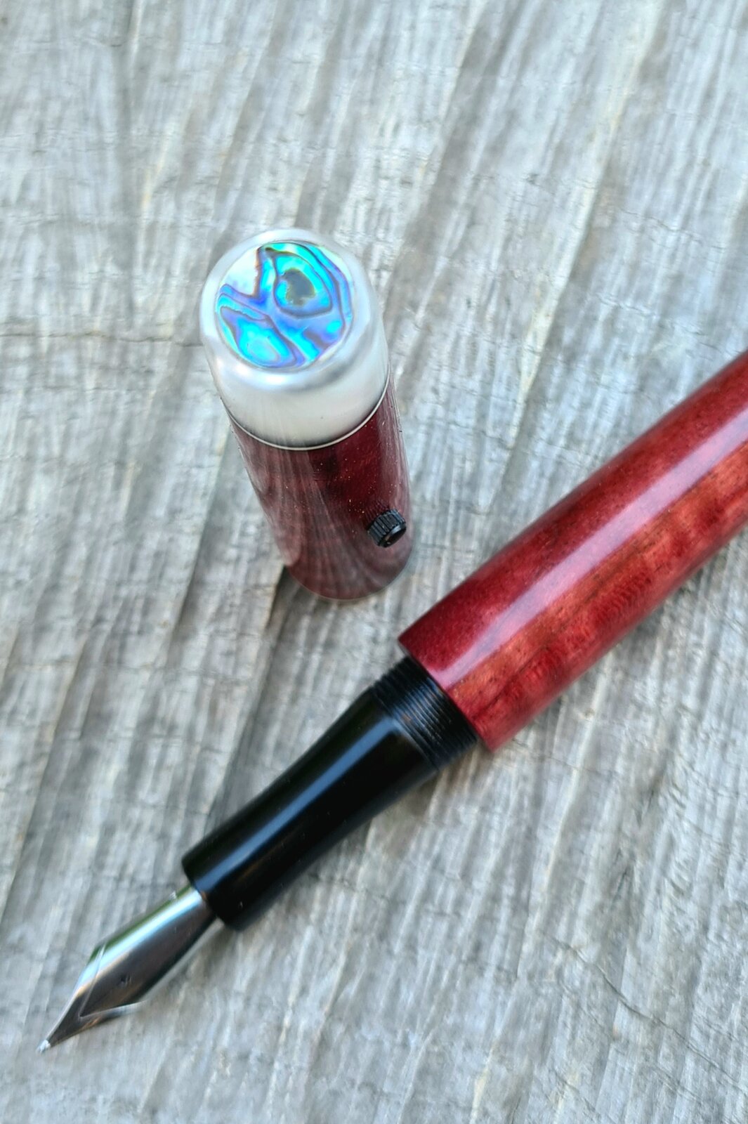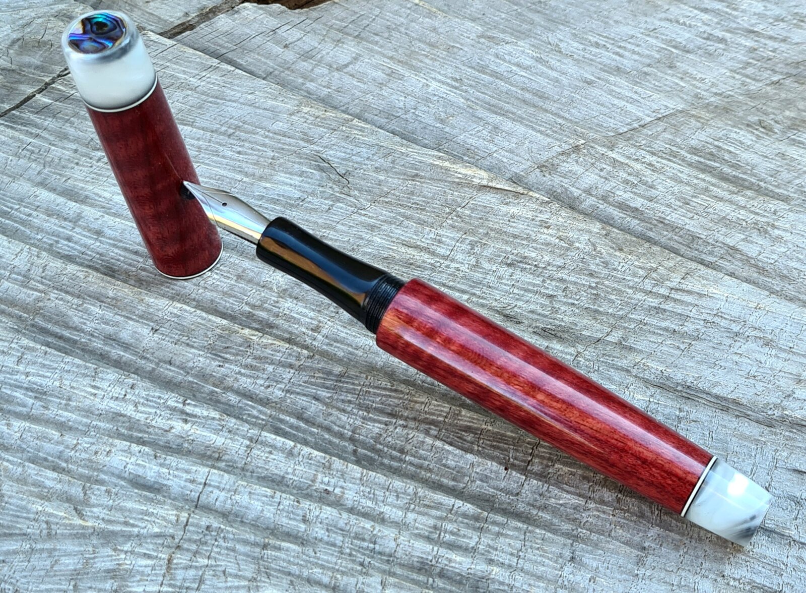 Ebonite section, Jowo #6 b, marble acrylic finials with abalone coin inlay, spacers, watch crown roll stop, CA finish.