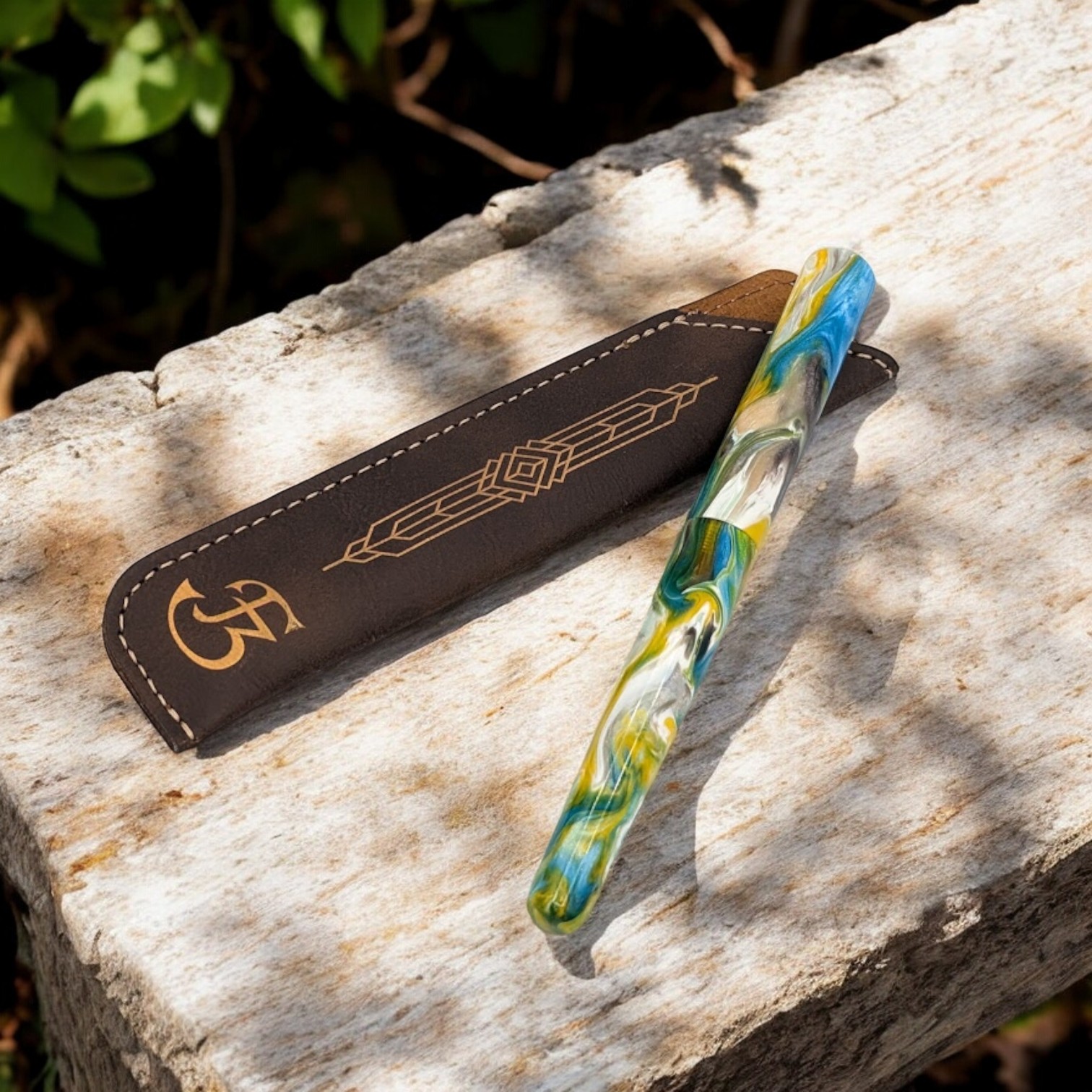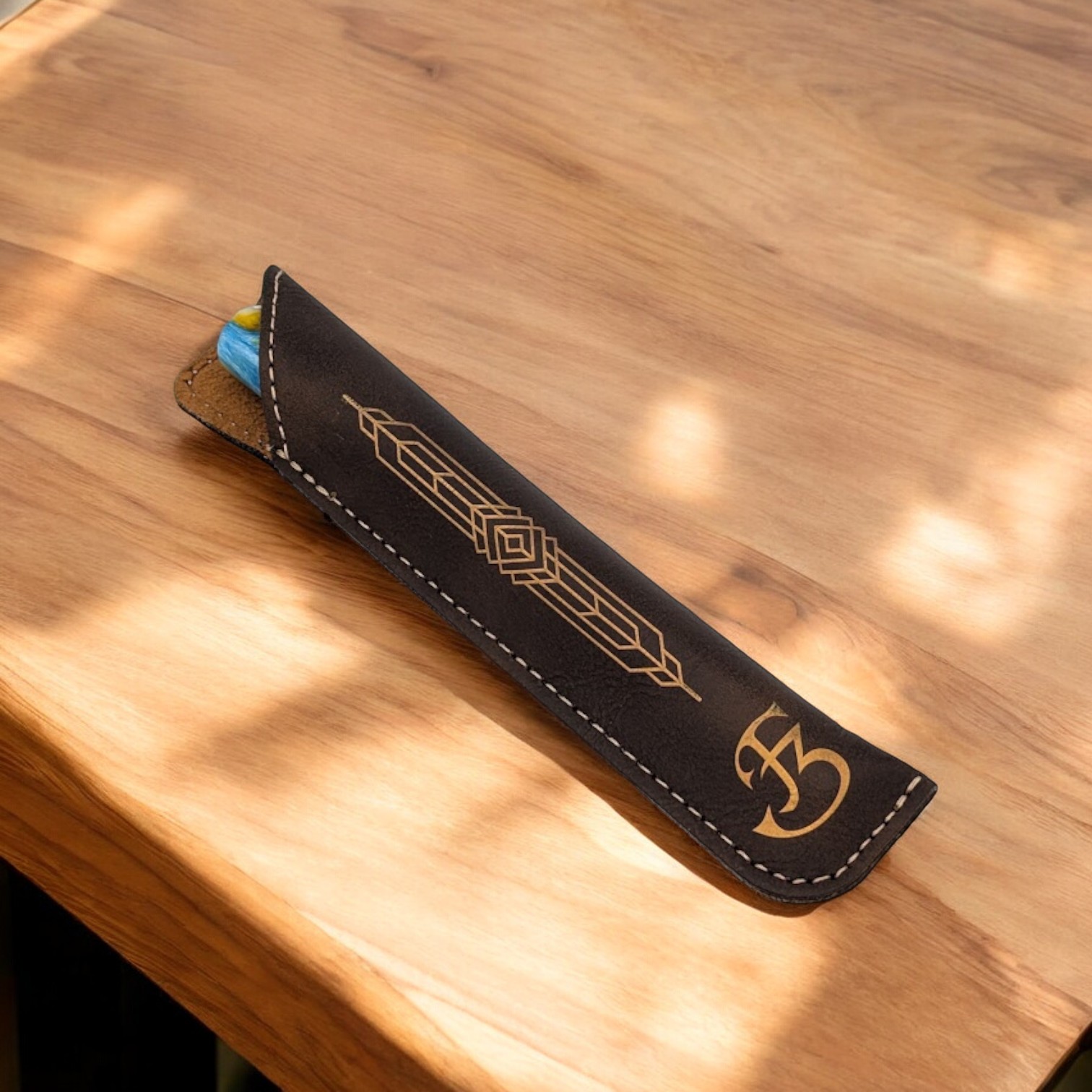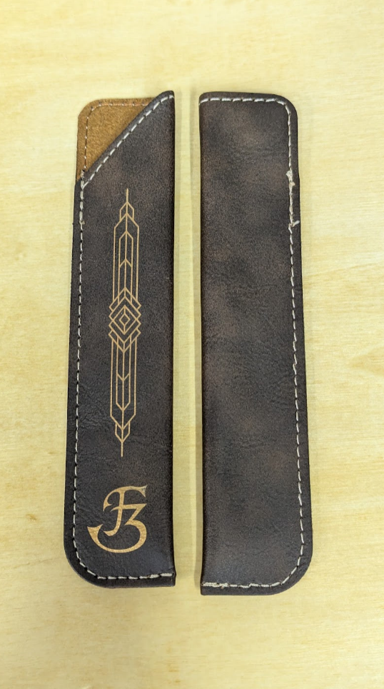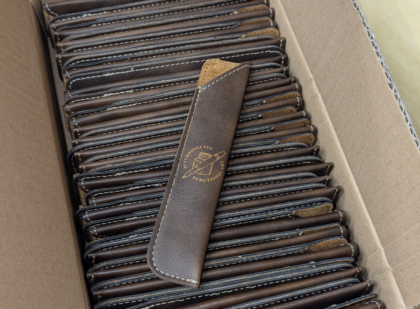 Custom branded leatherette pen sleeves. These sleeves should accommodate most kit pens and any pen up to around 16mm in diameter. For larger diameter pens I recommend pre-stretching with a smooth dowel or similar. The pen in the video below is 16mm in diameter.