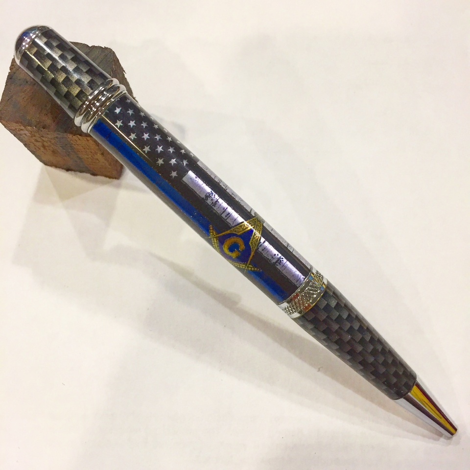 A good friend of mine has been waiting about four months for this pen! He came to me and asked if I could do a custom logo cast thin blue line and Mason pen. I happily obliged and created the blank using a custom logo printed on adhesive silver paper and cast in Alumilite. I paired it with a carbon fiber patterned Sierra Nomad.