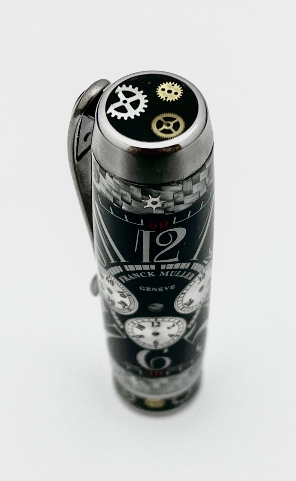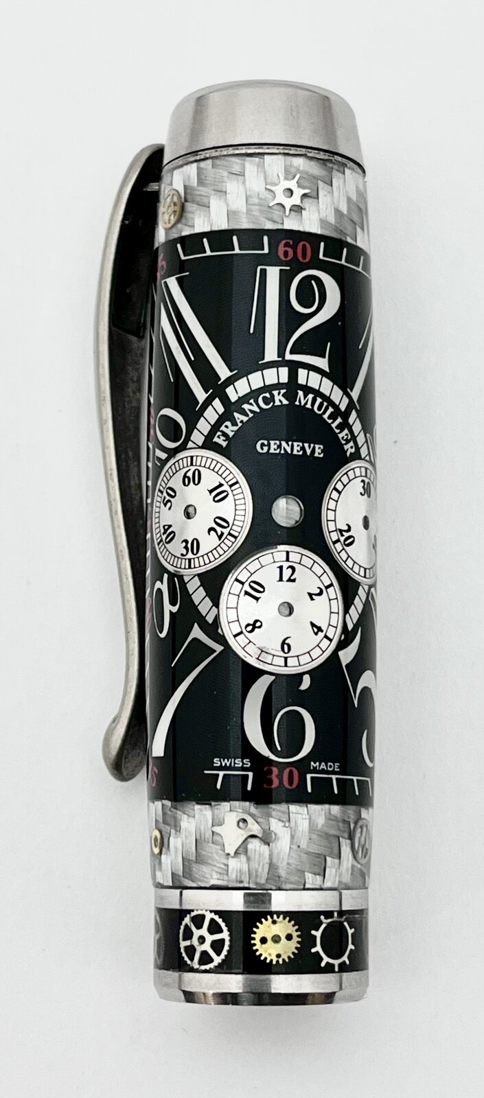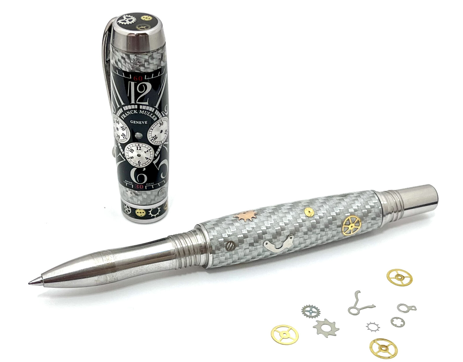In a recent conversation with Ed Brown he asked if I would make a couple short videos on how I construct some of my custom parts for the new Band-It pen (my new "Go To" pen set). I had some blanks set aside for myself, that I usually end up giving away before I get around to turning them, so I thought I would put one to use. This is a silver woven fiber blank I cast with a few watch parts and face. I wish I would have put more on there but at the time I thought it might over power the fiber. The black face worked very well with the silver so I decided to construct a center band and finial to match. I'm wondering what it might look like with a small black band at the lower end just above the threads to match the center band. Maybe next time... Here's the result. I'm pretty happy with it and will probably keep it unless I have a weak moment. If you're interested in how I made the center band and finial, Ed will be posting the videos on Exotic Blanks YouTube Channel.