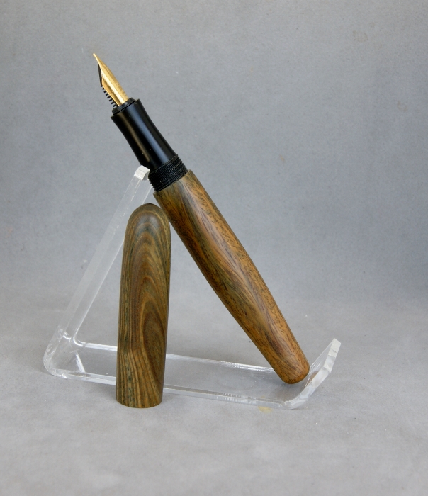 I wasn't patient enough to wait for it oxidize and turn back to green. So I'll just have to post more pics at a later date. This is another fresh off the lathe. I had a lady contact me about making her a pen with lignum vitae and even though she decided to wait for a later date she offered to send me several blanks of true lignum. This stuff is beautiful! This one is just me playing around a bit. I wanted to test the wood unfinished to see if it'll stain/hold up to daily use. This is by far my favorite non burl wood. It smells so nice I couldn't make myself put a finish over it. So this'll be mine for the time being. It's clipless and has an ebonite insert in the body only. The cap has wood threads (another test). Black ebonite section with a Schmidt nib.