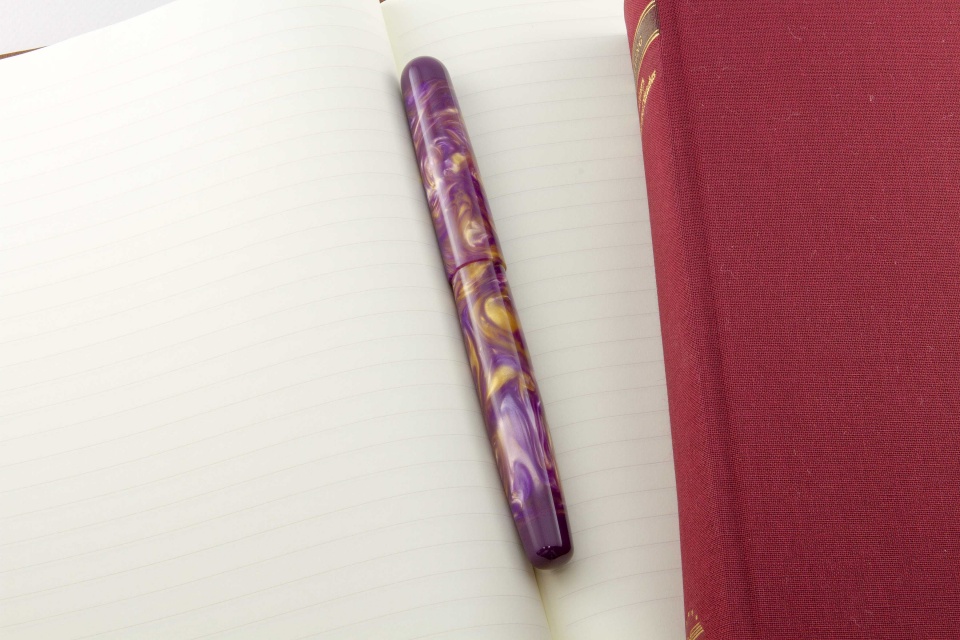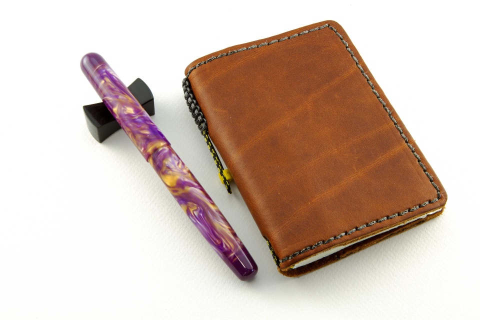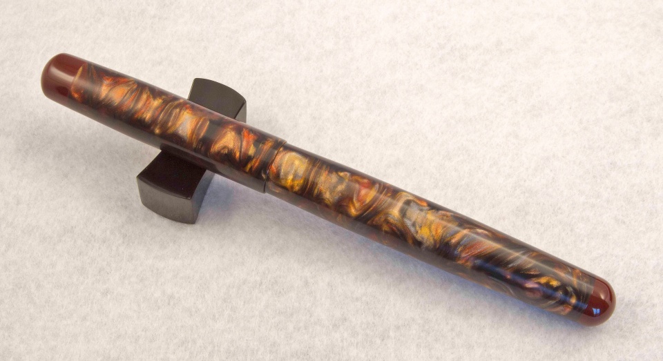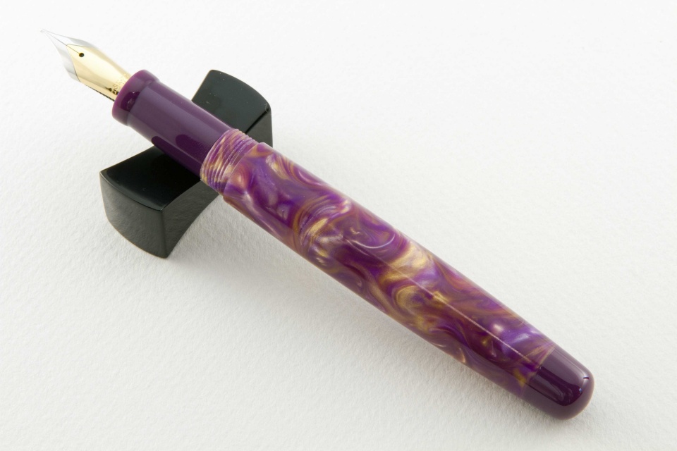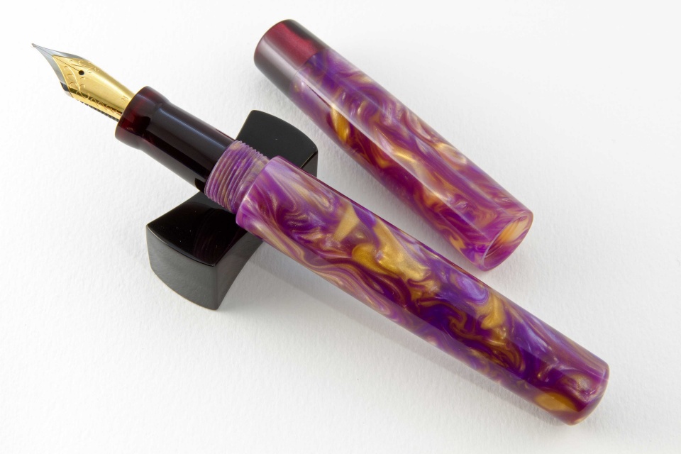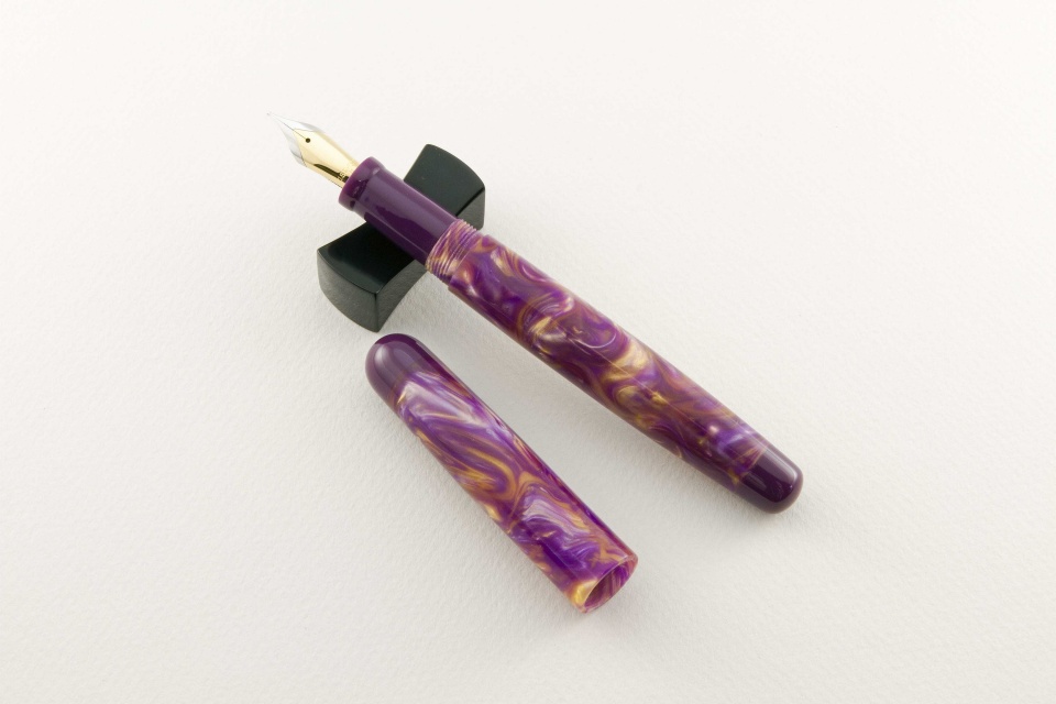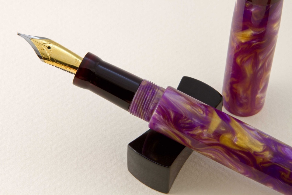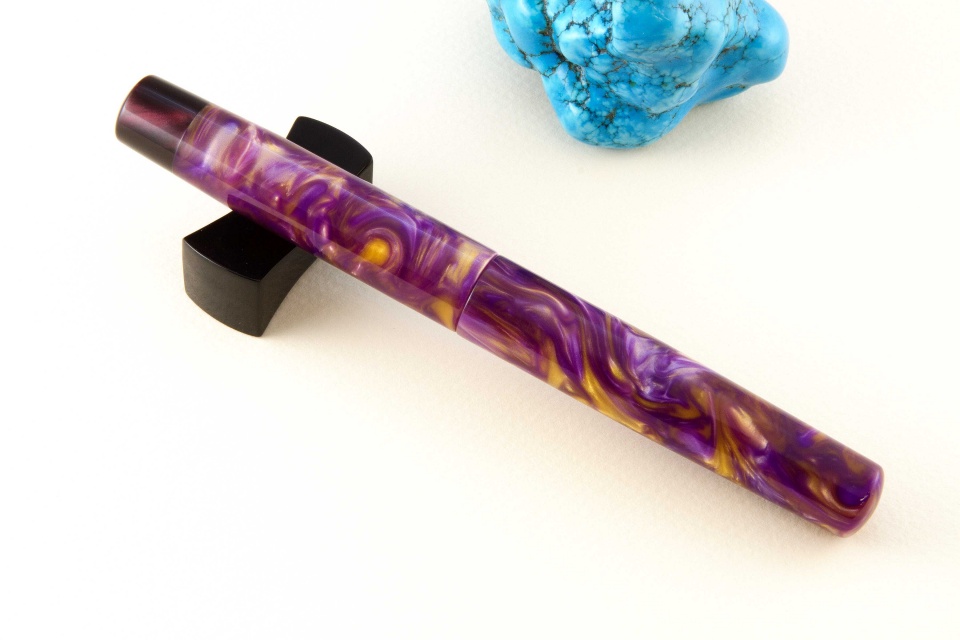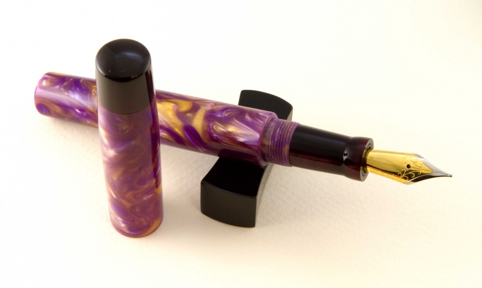 It had been a while since I posted pictures of fountain pens I have completed. This pair is done in purple and gold Flexigran, but different in style. Neither pen has a clip because clips were not desired. On the smaller pen with the rounded finials, I worked with Bob Dupras to come up with a solid alumilite color for the finials and the section close to but not exactly the same color of purple of the Flexigran. The other larger pen has the single finial done in Italian resin. For those interested, the Flexigran and the Italian resin both came from Richard L. Greenwald.