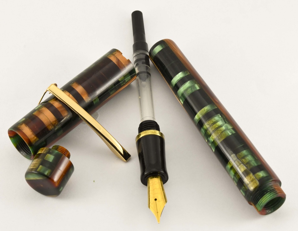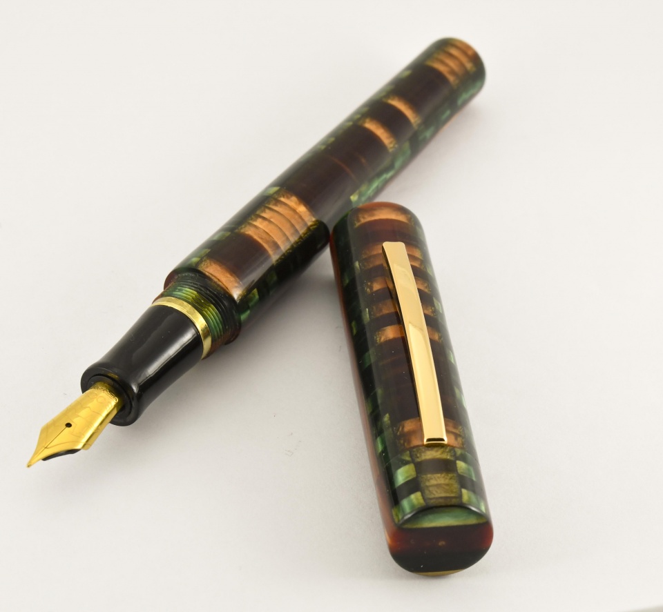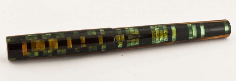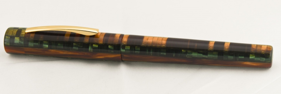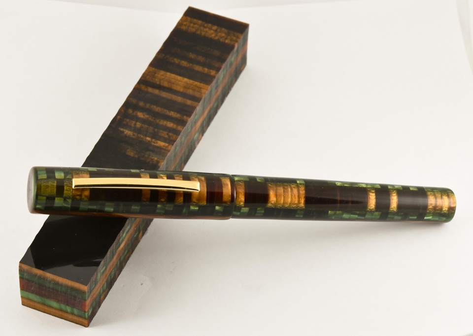 Finished this one today. It's a custom fountain pen made from a composite material originally used by Conway Stewart Pens. Reminded me of the colors in a forest. The last picture is the view of pen away from the clip. Sports a gilded Bock #6 nib. Was challenging material to work with but had fun making it. Hope you like it. Doc