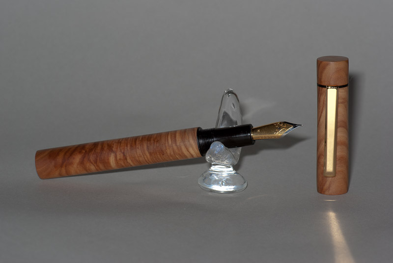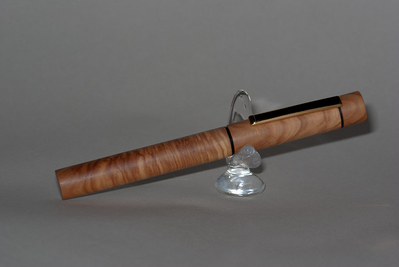 Here's the end result, after I'd given it a wipe down with Mahoney's Walnut Oil and then buffed with carnauba wax to give it some protection. The nib is a JoWo #6 two-tone (from Meisternib.com) and the clip is a Ti/Gold Rineheart from ExoticBlanks.com.