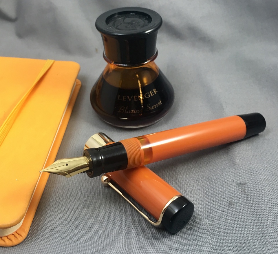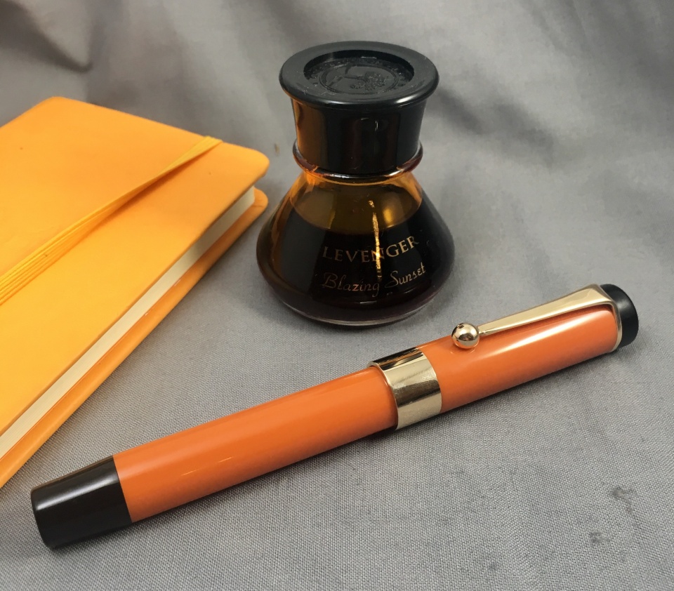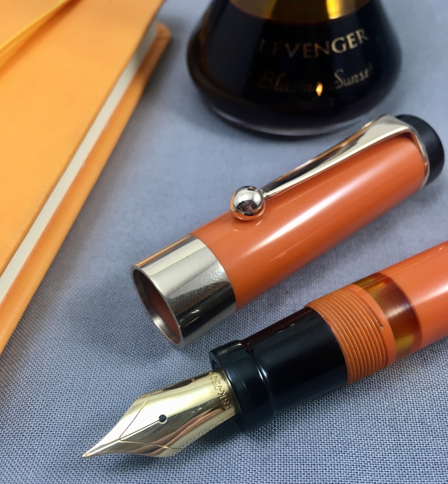 She wanted an oversized Parker Duofold inspired pen, that was built around a Jowo 18K #8 nib, and piston filled. I had the orange alumilite custom cast for me, as I wanted an oranged that closely matched the vintage orange duofolds. Black ebonite was used for the section and finials. The metalwork is hand fabricated from bronze. This was a fun pen to make!