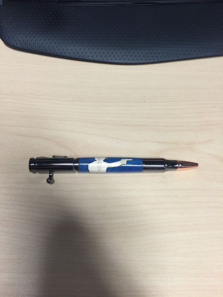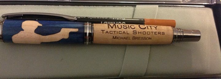 I made these pens for the Music City Tactical Shooter's club in Nashville, TN. Ken took their logo and cut out an inlay and the engraved the club and the names on the pen. I made one out of the Bolt Action as well, but did not have it engraved. This was pretty fun to do. Don't know whether it is a Glock or an M&P.